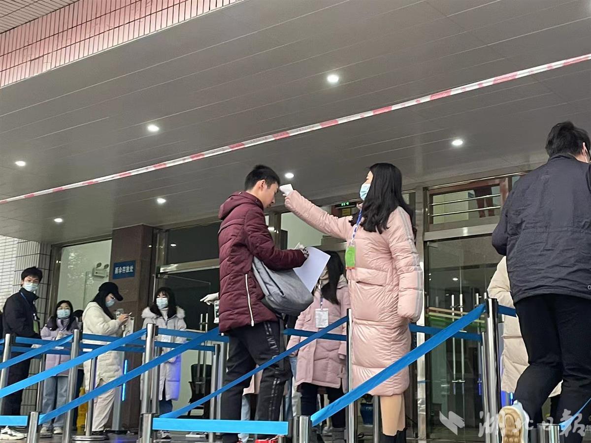 “请出示身份证、准考证。”当天早上7点45分许,在武汉大学文理学部教五楼考点入口处,工作人员依次检查考生体温,核查证件后,考生们有序进入考场。尽管天空中飘着小雪,不少考生仍手不释卷,抓紧最后的时间温习知识点。