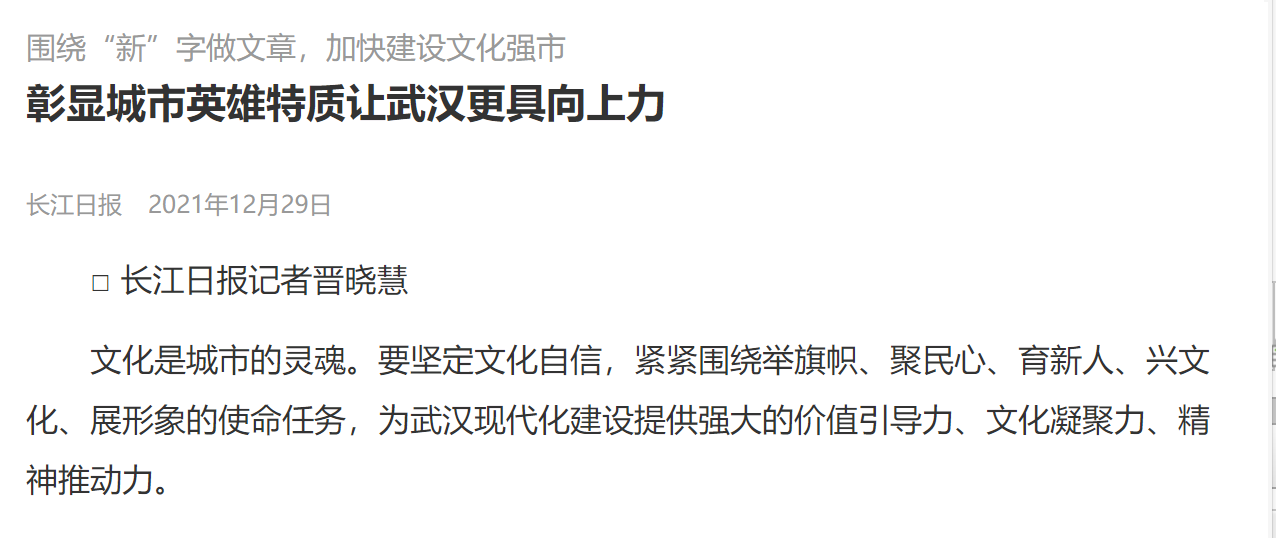 文化是城市的灵魂。要坚定文化自信,紧紧围绕举旗帜、聚民心、育新人、兴文化、展形象的使命任务,为武汉现代化建设提供强大的价值引导力、文化凝聚力、精神推动力。