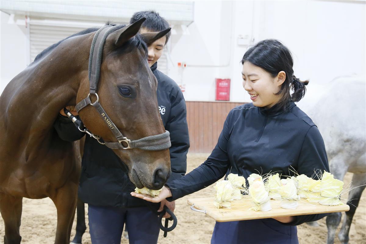 据学生余檬婷介绍,给马儿包饺子是希望马儿过一个传统的“中国味”春节。由于原料有限,大家优先选取了马儿最爱吃的胡萝卜、苹果作为主要馅料,而方糖就是调味剂。“这些食物,在马儿的眼里是宝贝,平时只有训练得好才能得到奖励。”余檬婷说。