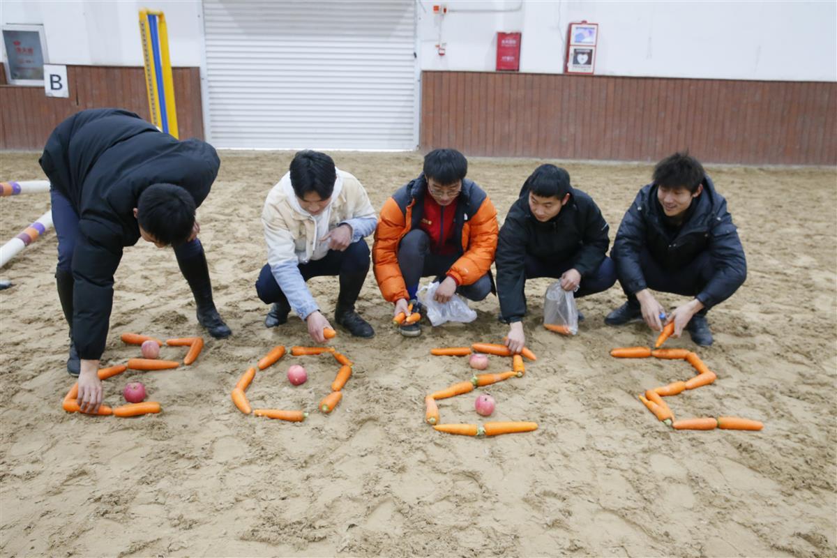 在室内马房里,吕文博和其他男同学将多余的胡萝卜摆放成了“2022”的字样,又带着马房内的14匹马“跃杆迎好运 ”。在多名学生“骑士”的带领下,马儿顺利完成三道障碍跳跃。“希望马儿跳过去之后,新的一年里能够身体健康,也让我们的训练配合更加默契。”吕文博说。马儿跳杆结束后,“水饺”也完成了制作,甜味饺子清新扑鼻,更调动马儿的食欲。