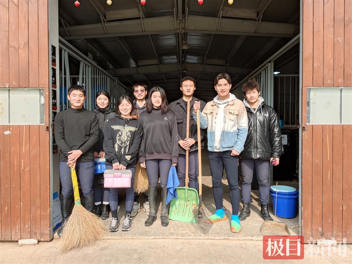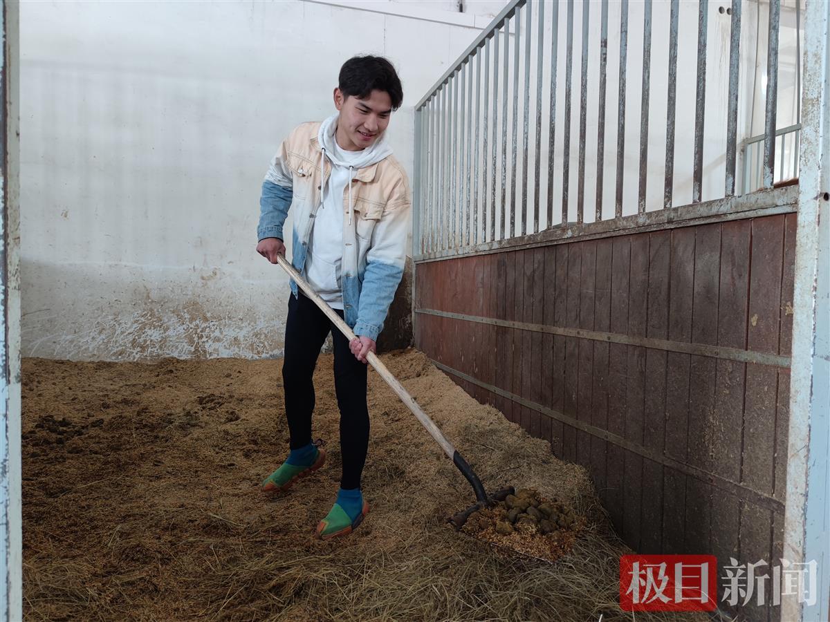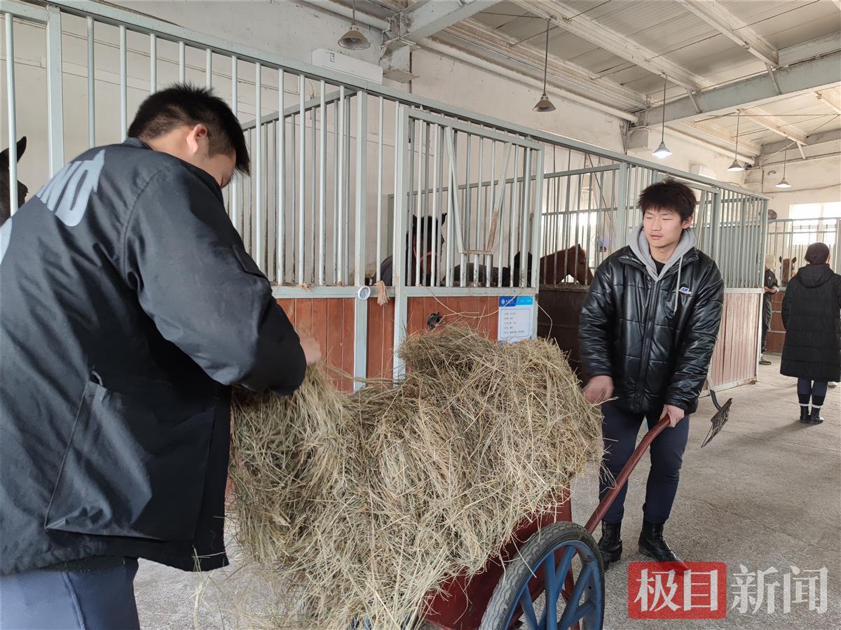从早上6时起床,到晚上10时清扫离场。刘一庄每天要在马房度过16个小时。喂食,清扫,训练,洗澡,检查,消毒……8名留校大学生过着忙碌而充实的一天。“每天一早打开马房,我们会先检查马儿的身体状况,然后进行喂食,一天的工作也随之开始。”据刘一庄介绍,喂食的草料会提前一天准备好,喂食的过程中,自己会和马儿“交流”一下感情,完成清扫马房、更换垫料等工作。考虑到疫情防控的需要,刘一庄和同学们在每天的清扫中加入两次消毒环节,确保马房安全。