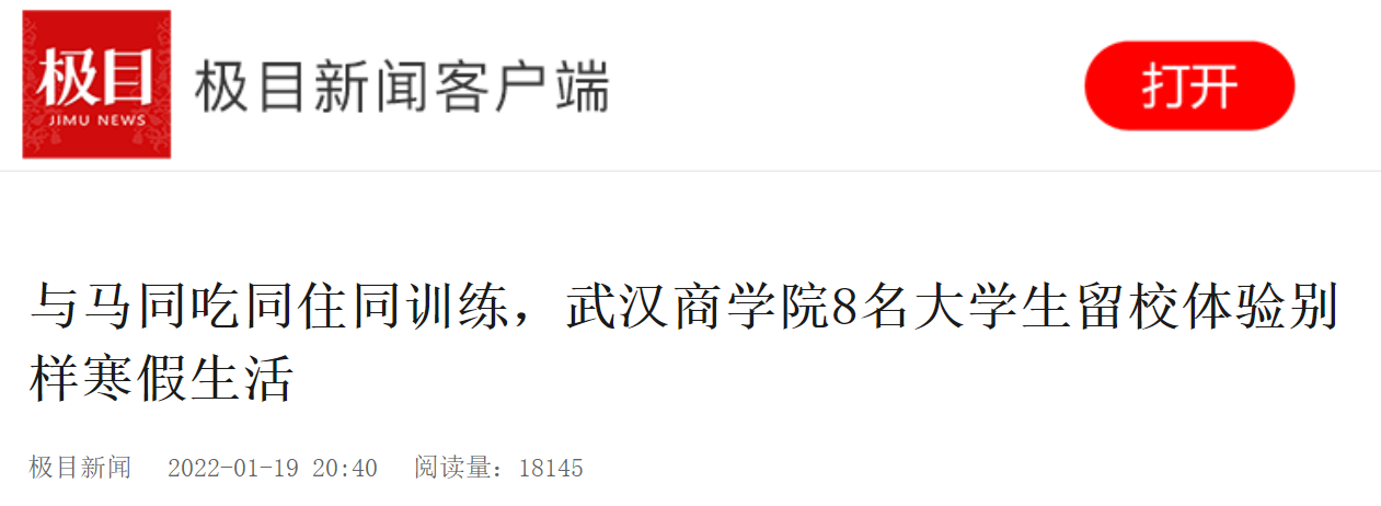 作为一个土生土长的武汉伢,这是刘一庄第一次留校过年。“爸妈挺支持我的,而且假期能与马儿在一起,这是最大的福利。”刘一庄说,平时上课,一周一般有两次马术实践课可以上马。“但是上课时间比较紧凑,人也比较多。”刘一庄说,假期能够抽出固定的时间与马儿相处,进行骑乘训练,自己的马术技能提升也比较明显。