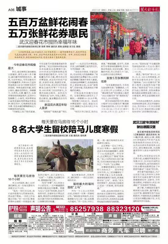 楚天都市报2022年1月22日A06城事刊登《每天要在马房待16个小时 8名大学生留校陪马儿度寒假》,报道我校8名学子留校陪马儿度寒假。