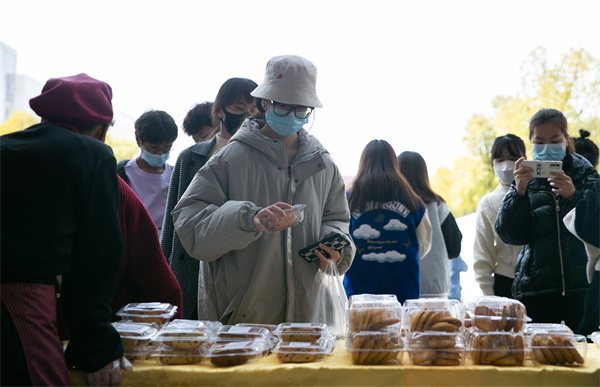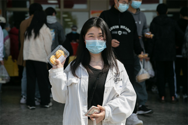 3月2日中午,南北区食堂门前早早摆满了提前准备的万余份岩烧蛋糕、戚凤蛋糕、老虎切片蛋糕、榴莲酥、蔓越莓等各式糕点,糕点分发现场井然有序,学生们规范戴好口罩、保持安全距离,有序签名领取“爱心”糕点。2020级人力资源管理专业的郭美伊拿到了自己最喜欢的榴莲酥,“此次‘送爱心’活动真的让我们感受到了学校的温暖,感受到了学校的用心,真的很感动!”郭美伊表示。
