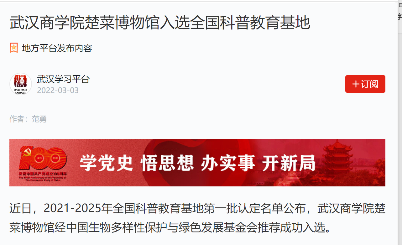 近日,2021-2025年全国科普教育基地第一批认定名单公布,bwin必赢中国官网楚菜博物馆经中国生物多样性保护与绿色发展基金会推荐成功入选。