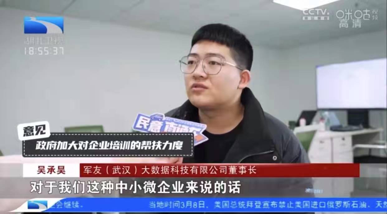 本网讯 近日,我校大四学生吴承昊在社交平台发布了湖北卫视的采访视频,作为军友(武汉)大数据科技有限公司董事长,视频中的吴承昊侃侃而谈,收获了一大批校友的点赞和留言,不少吴承昊的亲友看到后纷纷留言:“看着他一路走来,不容易”“做自己热爱的事,为他感到高兴!”