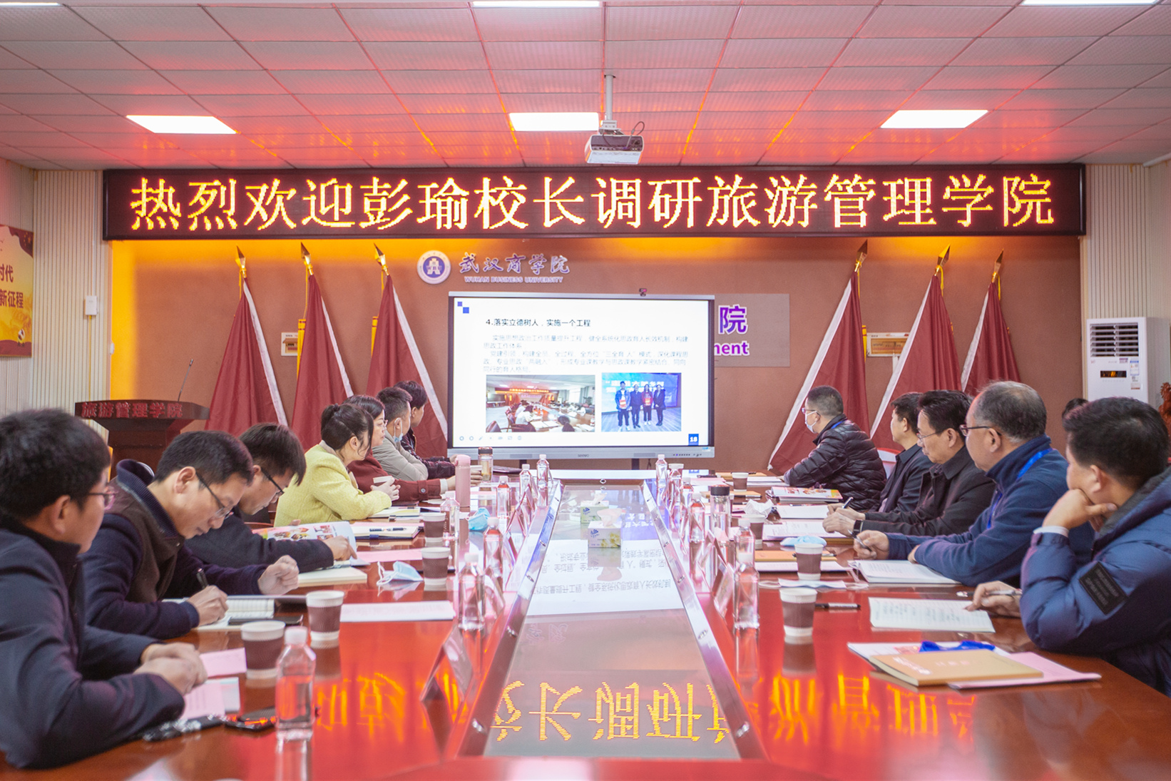 校长彭瑜充分肯定旅游管理学院的发展情况,认为旅游管理学院历史久、规模大,师资强、质量高,效果好、队伍优,党建强、发展强。彭瑜重点关心学院高等人才引进、毕业生就业、学生工作网络架构等问题。彭瑜表示,目前,学院要落实疫情防控工作,把疫情防控常态化作为当前的一项重要工作抓好抓实,要坚持从严管控、坚持不懈、科学监控,对疫情防控期间出现的各种情况进行及时跟踪、尽快反馈;聚焦学校“十四五”目标,抓好学院高质量发展,统筹推进学科建设、人才培养、社会服务、数据管理、师资队伍力量的建设,在学生工作方面要取得长足进步;要加强政治建设、严肃党的纪律,擦亮学院“党建+”品牌,坚持好的做法,保持奋斗姿态,全面加强从严治党,加强党风廉政建设和师德师风建设。