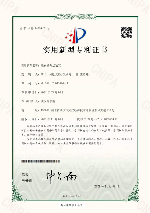 扬新时代中国青年就业创业之帆,我校作为应用型本科高校,注重创新实际应用,探索把真正的顶尖的创新技术运用在设计发明上,鼓励每一位学子敢创新、勇创业。目前,分层洗衣机已申请一项实用新型专利,论文《基于波轮式洗衣机的分层洗衣机的设计》在《科学与技术》杂志发表。