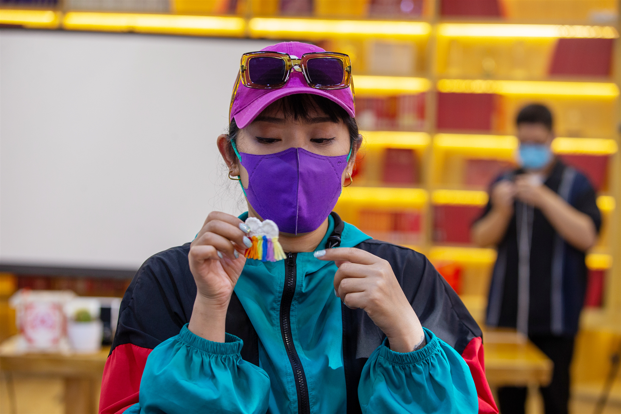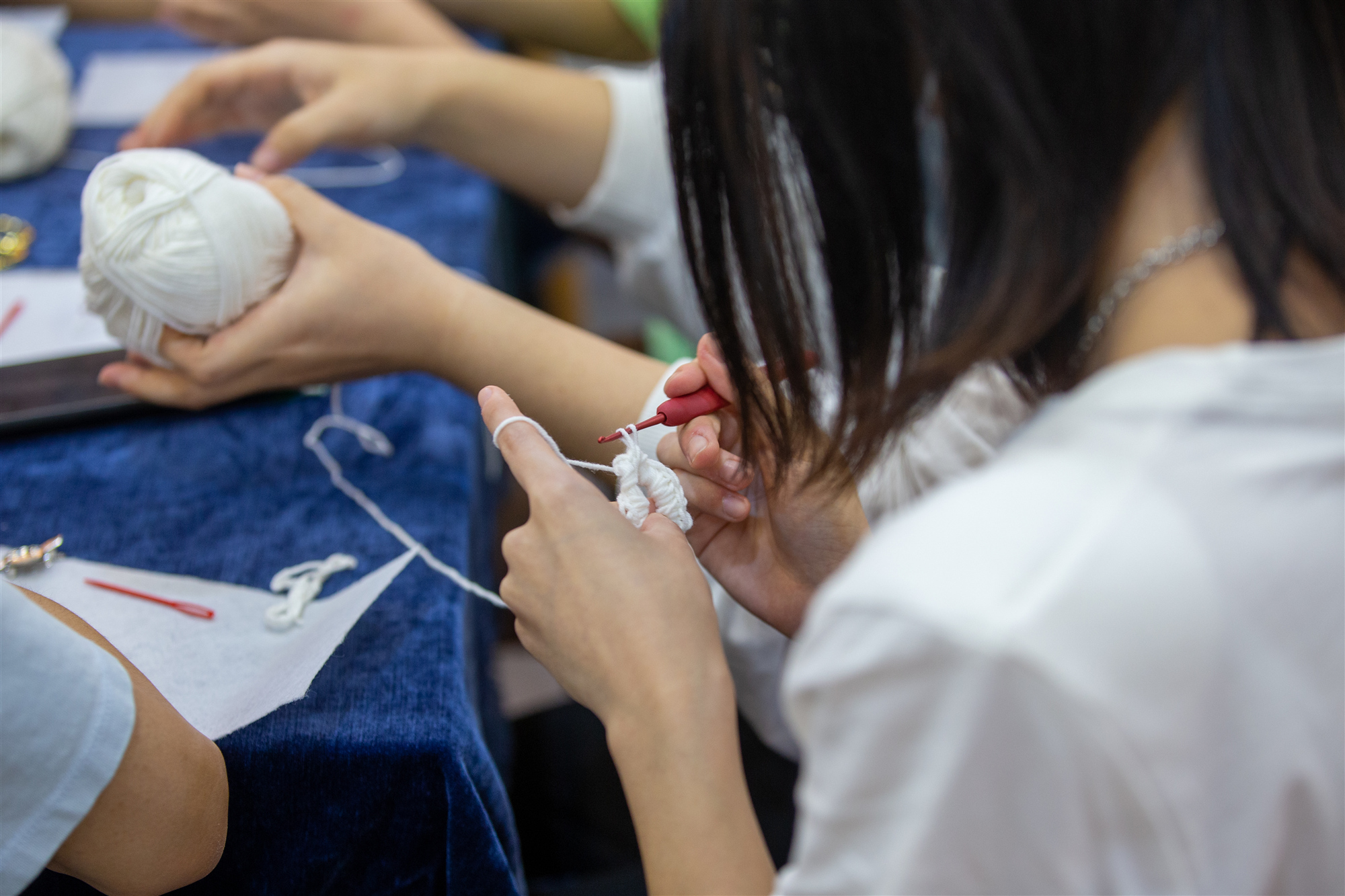 岁月无声,一针一线蕴藏巧艺智慧;一钩一转,牵引文化气韵。现场,凃洁给大家传授“祥云”的钩编基本针法。祥云,自古以来便寓意着人们对吉祥、喜庆、幸福的期许。钩编,看似易,实则难。一根钩针,一团毛线,在主讲人的手里仿佛有了生命。钩针挑起毛线,丝滑又流畅,自如且灵动,给同学们带来了一场视觉盛宴。凃洁示范后,下台走到同学中教学,学生们左手大拇指与食指紧捏线圈,右手手持钩针,钩编祥云的模样。凃洁走到一位男生旁边,左手捏起线圈,右手握紧钩针,钩起一根毛线,从线圈穿出,随后再钩起一根毛线,重返于线圈,循环往复,整个过程行云流水,一气呵成,引得台下惊呼。