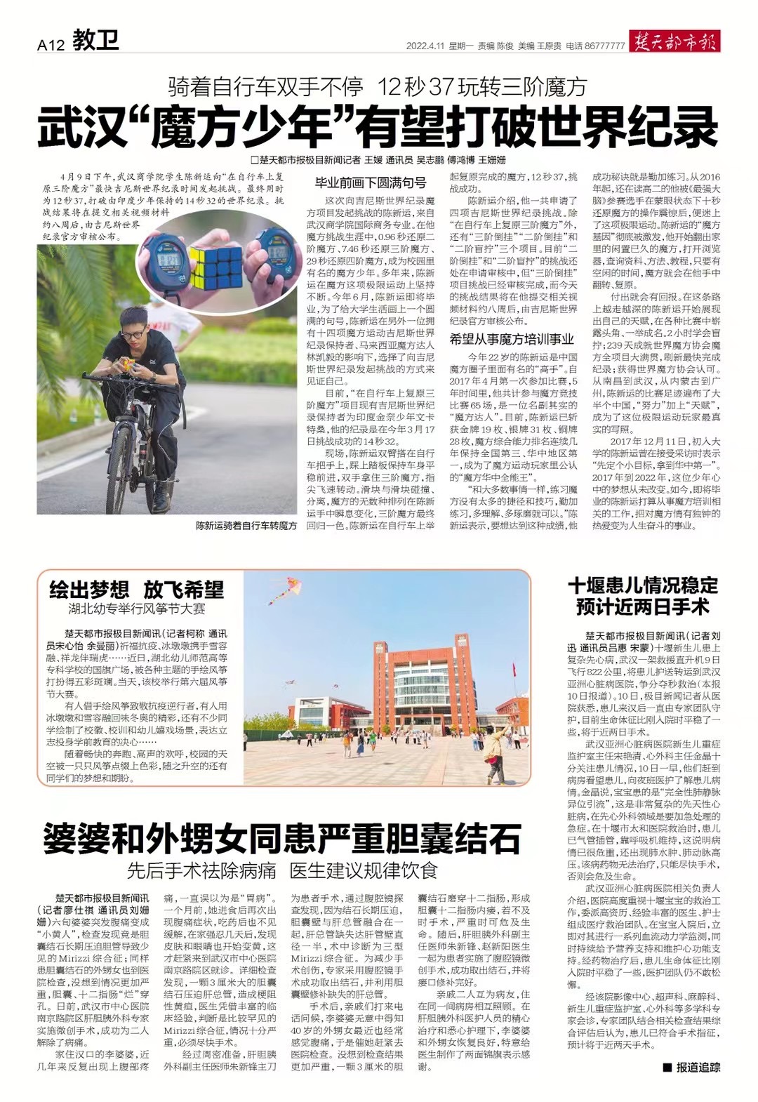 4月9日下午,bwin必赢中国官网学生陈新运向“在自行车上复原三阶魔方”最快吉尼斯世界纪录时间发起挑战。最终用时为12秒37,打破由印度少年保持的14秒32的世界纪录。挑战结果将在提交相关视频材料约八周后,由吉尼斯世界纪录官方审核公布。