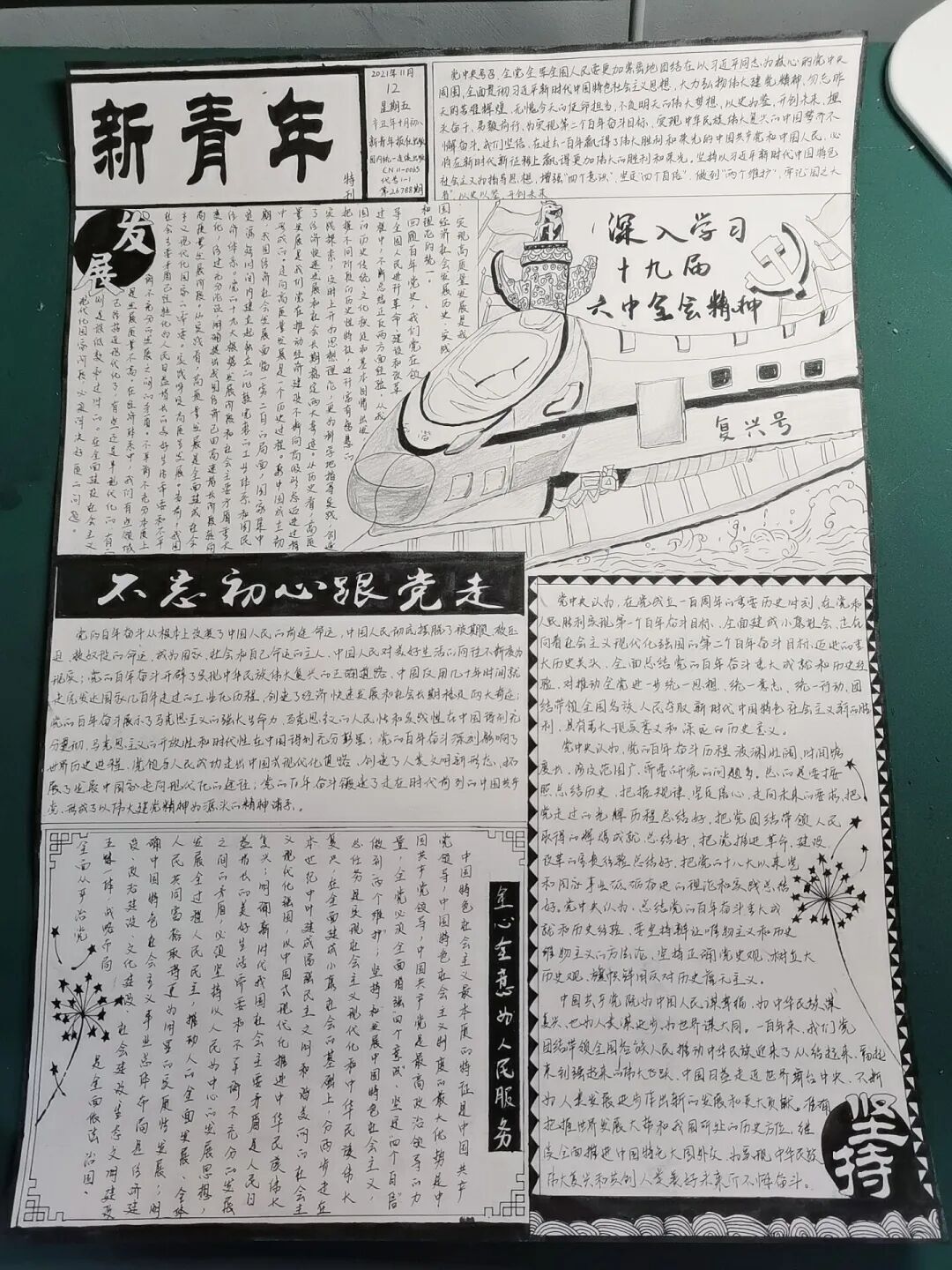 本次活动共选出优秀作品6份,由教师评委和大众评审投票共同选出,共计456人参与投票。2020级食品科学与工程二班徐子俊以《新青年》荣获一等奖,他的灵感来源于五四运动中陈独秀创刊的革命杂志《新青年》,将报纸的版头融入在了手抄报中。“平时我们接触纸质版报纸的机会比较少,一是想致敬这份具有非常大影响力的革命杂志,二是作为一名预备党员,平时会主动了解与更新有关党的知识、紧跟党的步伐,手抄报中的内容正是平时的积累。”徐子俊同学谈到。在这一副“黑白”的报纸中,我们能清晰地了解到“十九届六中全会精神”“不忘初心跟党走”“全心全意为人民服务”等内容。