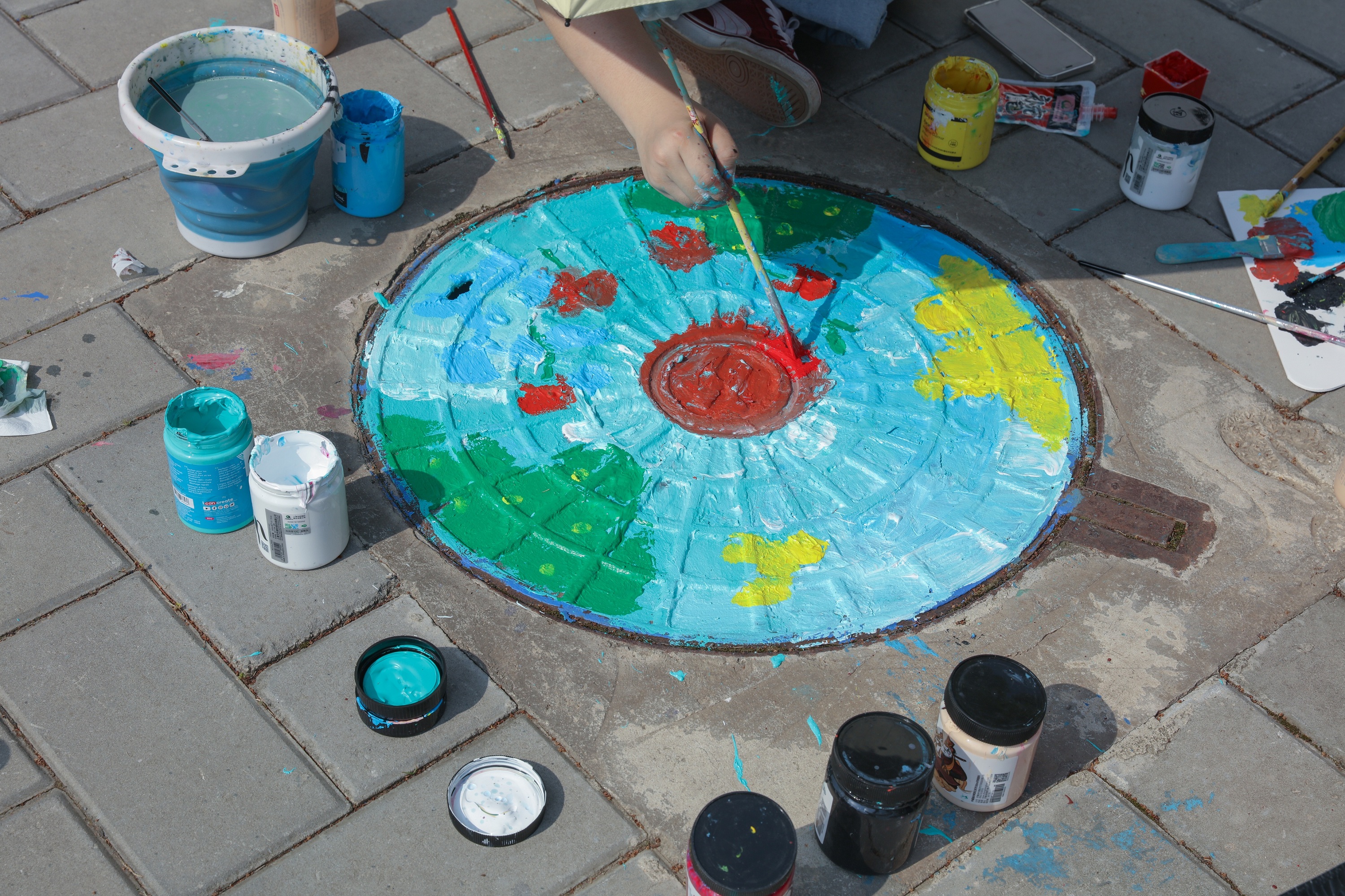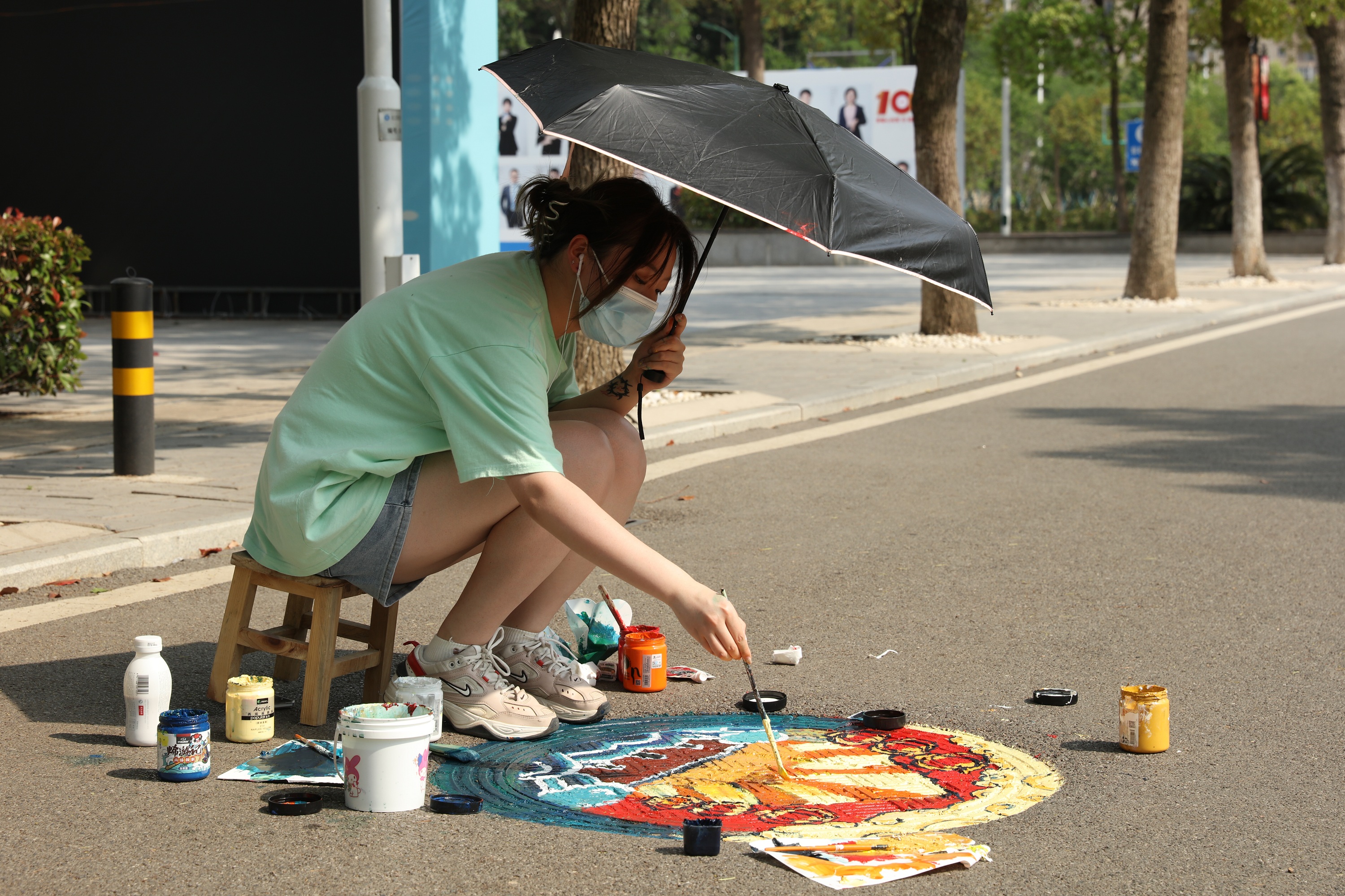 艺术学院的井盖绘画活动已连续举办三年,旨在引导学生发现美、装扮美、创造美。井盖是学校一张特殊校园名片,成为了校内一道特有的风景,同学们在欣赏新风景的同时,了解时事,感知艺术,以颜料为校园增色,借画笔传青春之声。