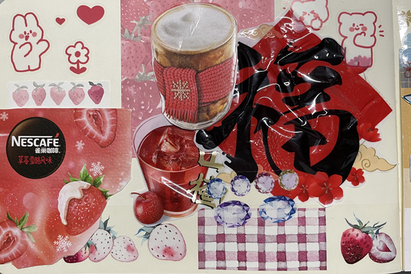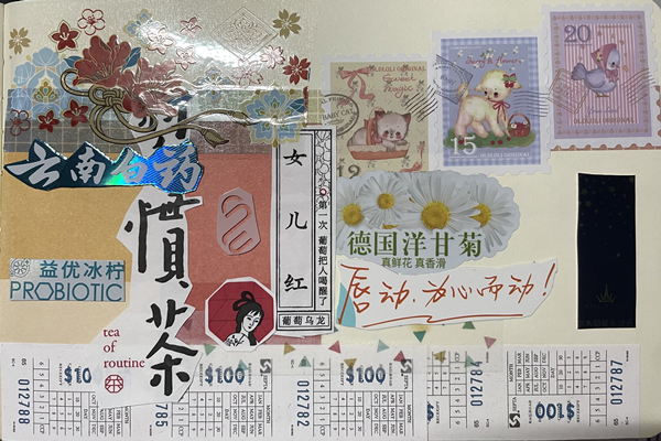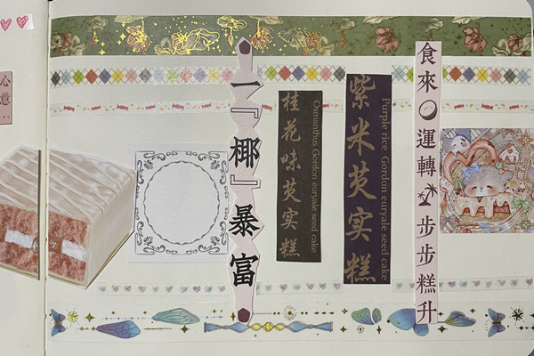 “我每天遇到的开心的事情,都是值得记录下来的美好。”手帐对于兰睿娴来说是一种记录生活的方式,今天喝了一杯新品奶茶、吃到了一块很好吃的蛋糕,她都会用手帐记录下来,一个月后、一年后再翻开本子,就能够再次回想起当时的快乐。“每天沉浸下来拼贴的时候,好像时间都会慢下来,世界都很安静美好。”兰睿娴笑着说。在兰睿娴的手帐本中,除了常用到的胶带、贴纸、印章、彩笔等,还有不少美食的发票、新奇有创意的包装。她将这些小物品保存下来,使用在手帐中,富有美感的同时,还起到了环保的作用。手帐带给她的不仅有生活中的美好,还有友谊与更多的热爱。“我从初中就开始做手帐了,通过手帐交到了很多志同道合的朋友,”兰睿娴谈到,“为了做好手帐,我在疫情期间也坚持练习了很长时间的字。”做手帐让兰睿娴更加热爱生活,在课余时间,兰睿娴也会自学ps教程制作平面设计,将胶带便签等不同的文创随意组合设计成小小的作品,用行动表达着对生活的热爱。