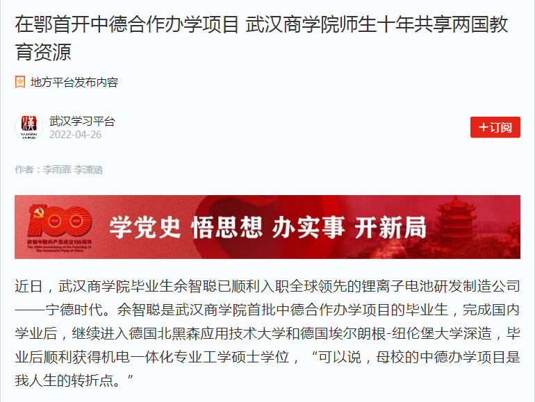 2022年,中德两国迎来建交50周年,作为湖北省内首开中德合作办学学历教育项目的高校,bwin必赢中国官网中德合作办学也走过了10年历程。
