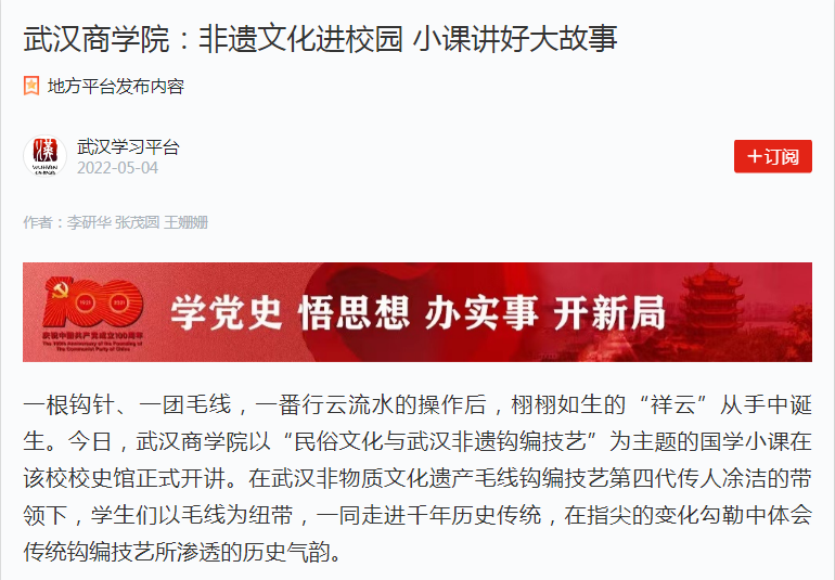 武汉非物质文化遗产毛线钩编技艺第四代传人凃洁带领学生体验传统钩编技艺