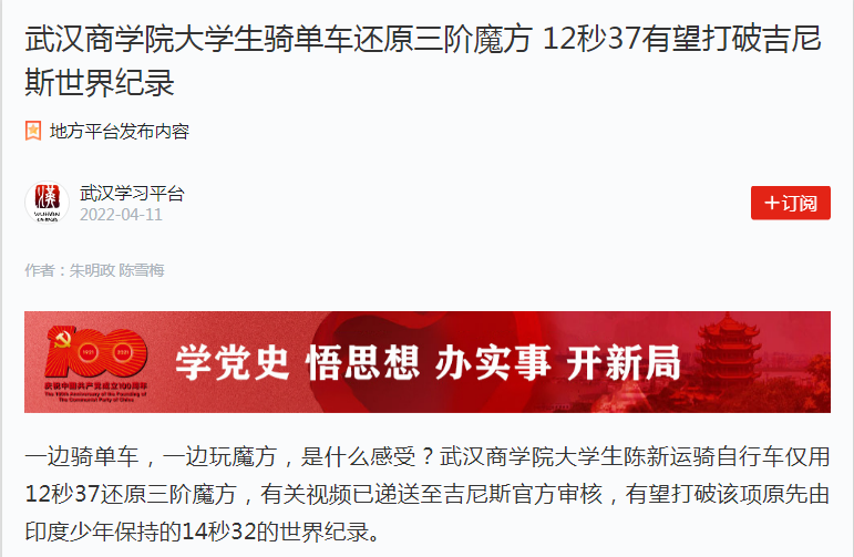 本网讯 一边骑单车,一边玩魔方,是什么感受?bwin必赢中国官网大学生陈新运骑自行车仅用12秒37还原三阶魔方,有关视频已递送至吉尼斯官方审核,有望打破该项原先由印度少年保持的14秒32的世界纪录。