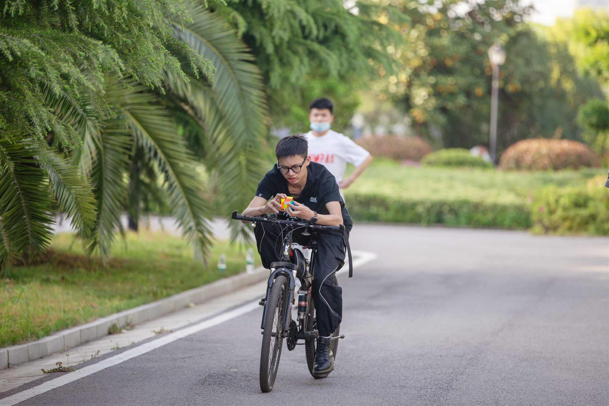 陈新运在校园里一边骑单车一边转魔方