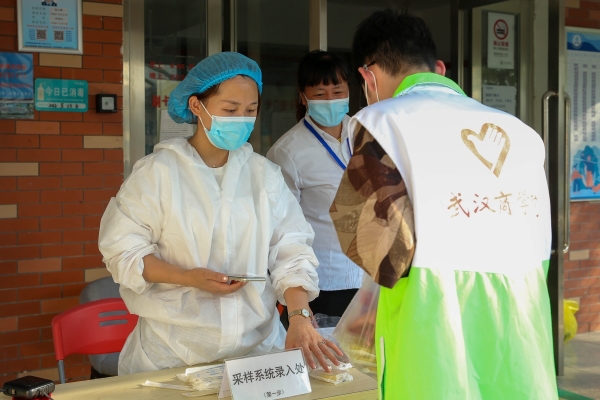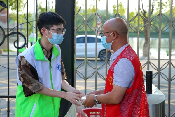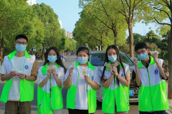 本网讯 5月23日下午,我校食品科技学院学院5名学生志愿者前往南北校区共9处核酸检测点,为医务人员免费赠送绿豆糕200余枚。