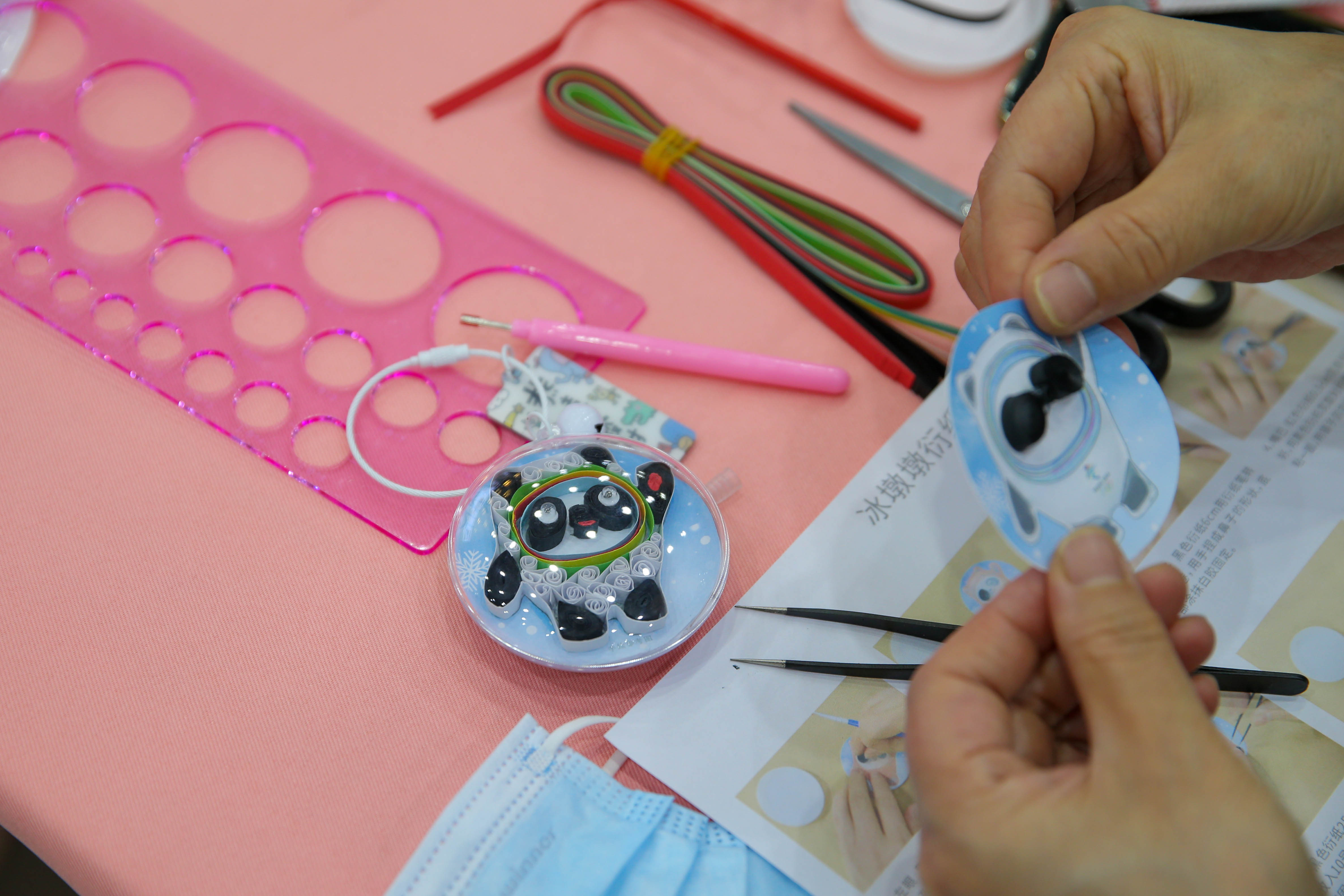 本次衍纸互动以冰雪运动为主题,各位女教职工在湖北省文化遗产研究会副会长陈静的带领下拿起桌上早已准备好的纸条、长针笔、衍纸尺、镊子、白乳胶等工具,依照操作流程逐步进行实践。不多时,活灵活现的冰墩墩和雪容融衍纸作品纷纷出炉。参与制作的老师们纷纷表示,之前从未尝试过衍纸这种手工艺形式,做完觉得新鲜又有趣,十分考验制作者的细心和耐心。