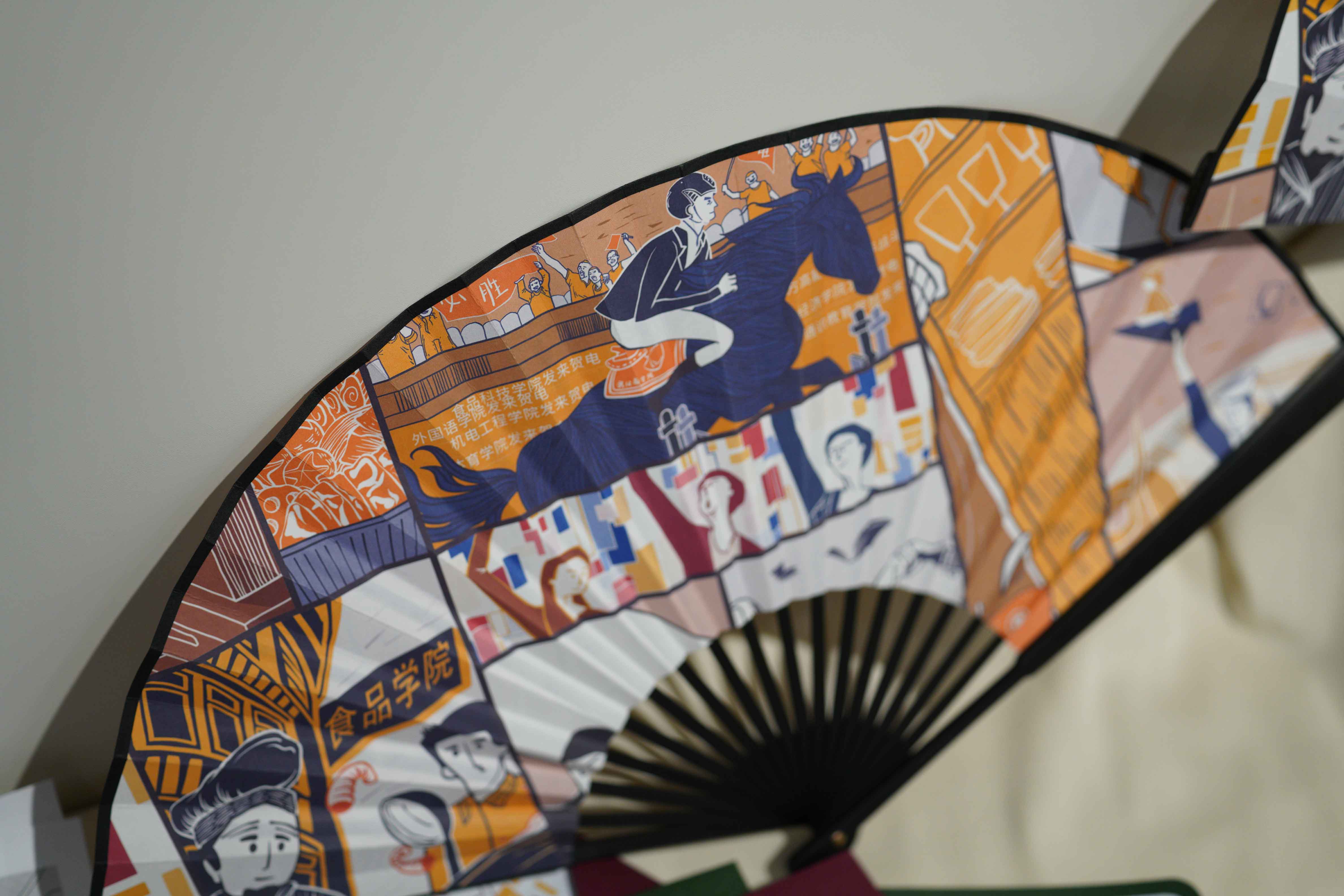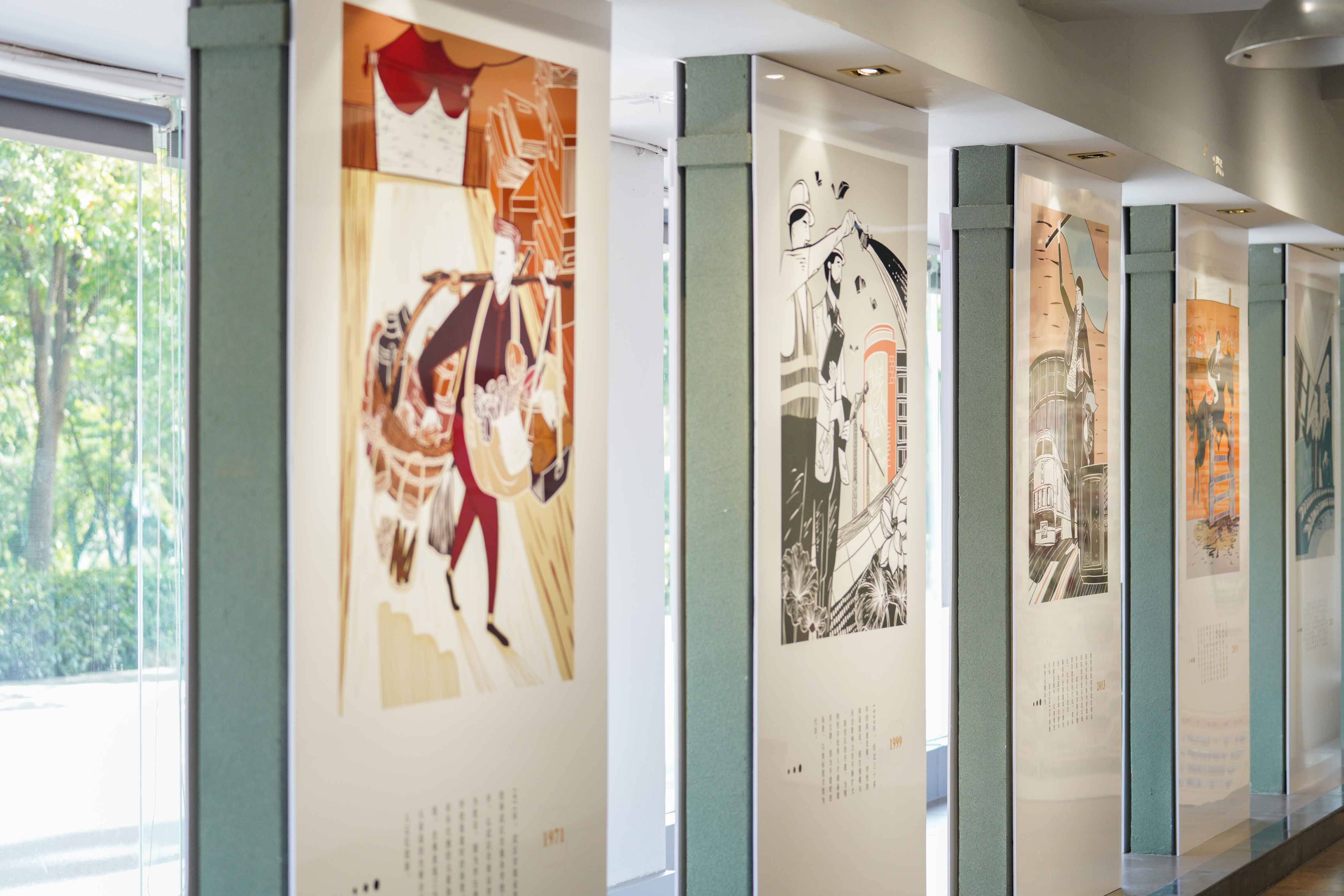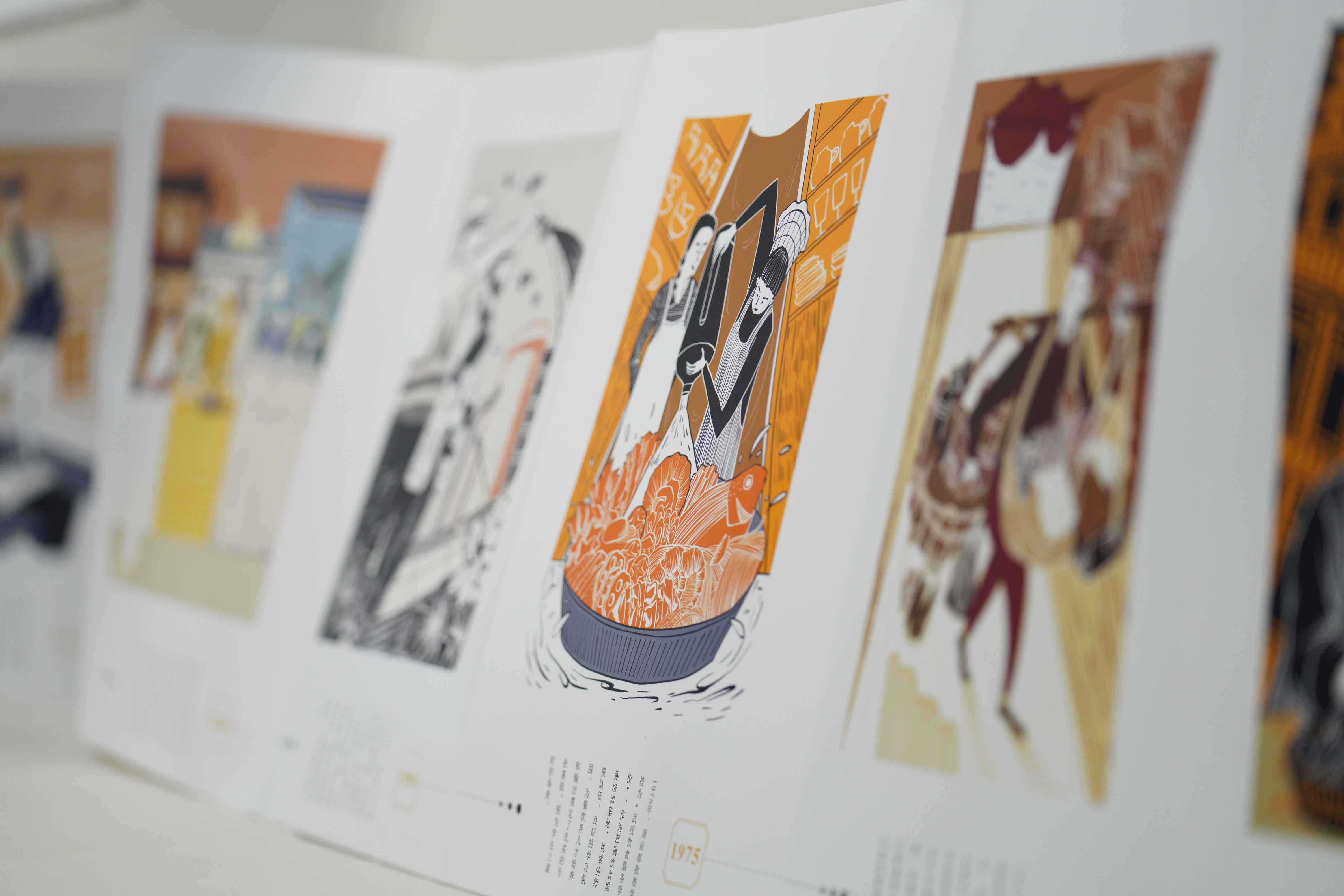 第三部分主题品牌IP(知识产权)展板共分为“时间的礼物”、“商吉吉”、“QQ人”和“商商”四个主题。2019级商务英语专业的杨晨翻阅时惊奇发现,图册每一页都与学校息息相关。“第一页画的是建校初期,往后每一页都见证了学校的一次飞跃!”杨晨分享说。基于校园特色而呈现的展品,学生在设计上下了不少功夫。根据学校发展历史并深入校史馆并借鉴版画风格创作,历时两个月,这组“时间的礼物”图册才正式付梓展出。该图册展现了学校发展重要时间节点,也是艺术学院师生为我校即将到来的60周年华诞共同献上的一份礼物。