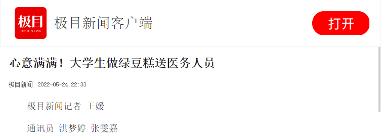 拆开精美小巧的包装后,绿豆香气扑鼻而来,这是南区核酸检测人员桂檬第一次吃到学生制作的绿豆糕。“清甜可口,和市面上卖的很不一样。”桂檬说,“品尝到了学校学生们满满的关心与爱意!”“绿豆性味甘寒,有清热解毒的功效。天气炎热,希望能给忙碌的医务人员祛祛暑气。”食品科技学院青年志愿者协会会长陈友俊分享道。