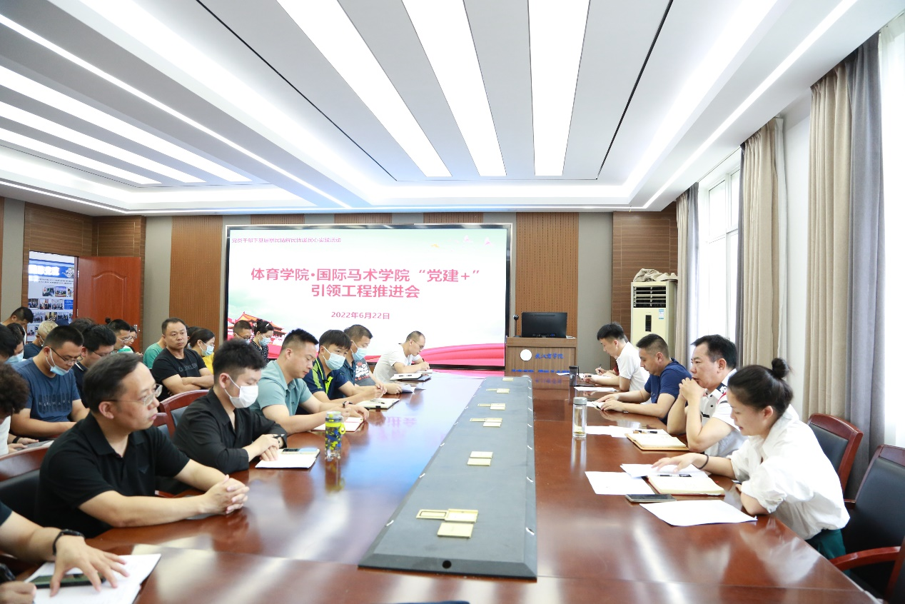 本网讯 近年来,体育学院·国际马术学院积极探索“党建+”工作模式,为全面推进学院党建与业务工作深度融、科学融、有机融,实现两者同频共振、同向发力、互促共赢,2022年6月22日下午,体育学院·国际马术学院召开了“党建+”引领工程推进会。院长李要南、党委书记吴媛媛、副院长马宏俊及全体党员参加了会议。