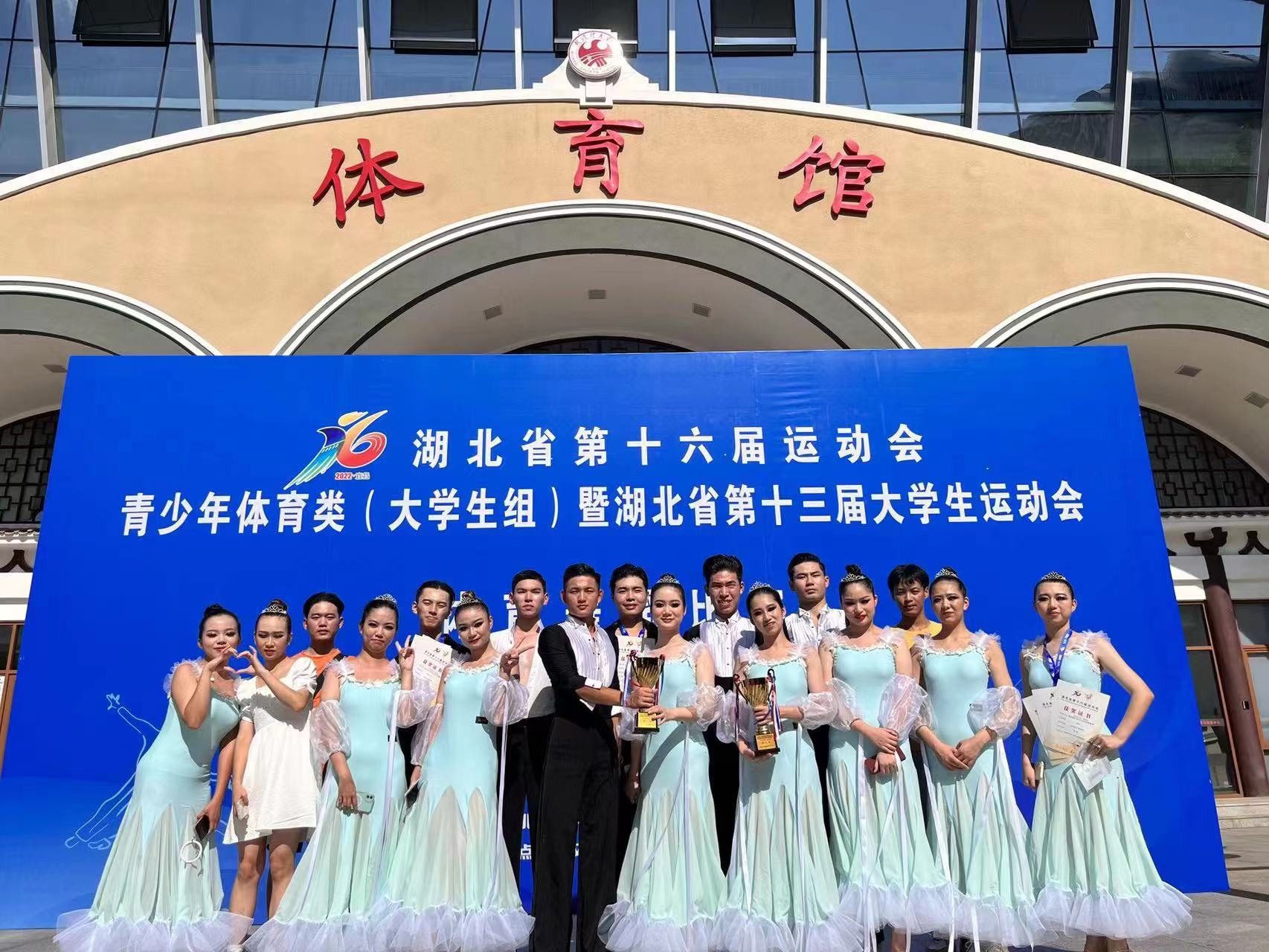 本网讯 7月9日,2022年湖北省第十六届运动会青少年体育类(大学生组)暨湖北省第十三届大学生运动会体育舞蹈比赛在武汉体育学院体育馆落下帷幕。我校体育舞蹈队26名队员在体育学院·国际马术学院教师潘璐、王丹的带领下获得了两金四银的好成绩。其中:拉丁舞团体舞第二名、校园青春集体舞第二名、六项全能组第一名、四项全能组第一名,B组标准舞第二名、C组标准舞第二名。