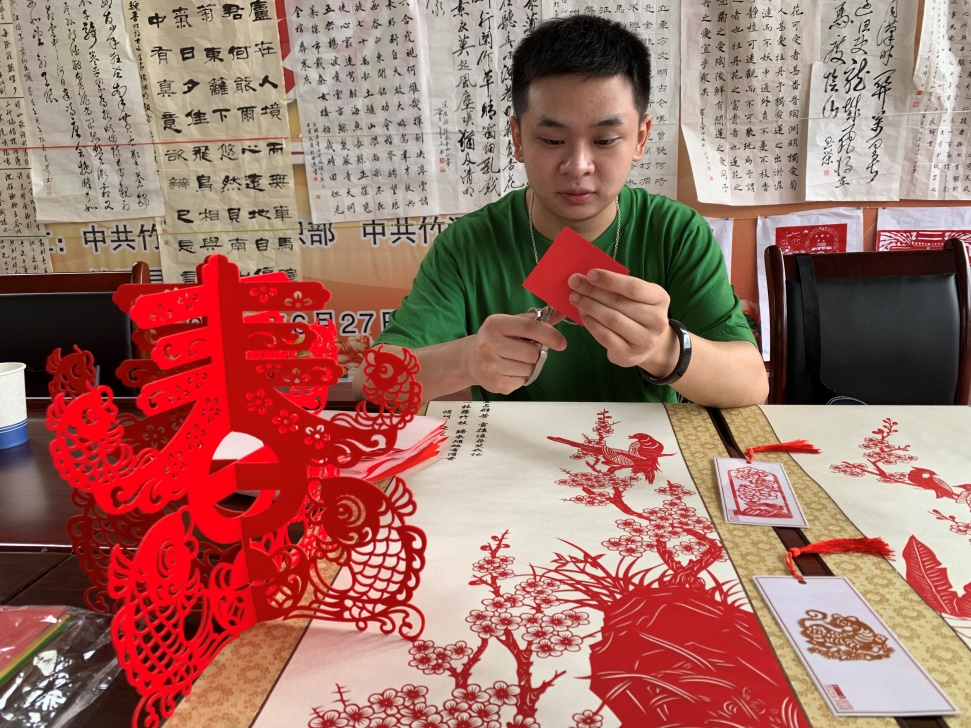 随后开展竹溪民间艺术家与艺术学院教师的文化交流活动。展台上挂着竹溪艺术家的书画作品,学院的教授专家们同作者进行交流和点评。由“堵河剪纸”的非遗传人、艺术学院青年教师周坤的剪纸表演,吸引了众多的目光,纷纷赞许他为“能工巧匠”、“心灵手巧”。