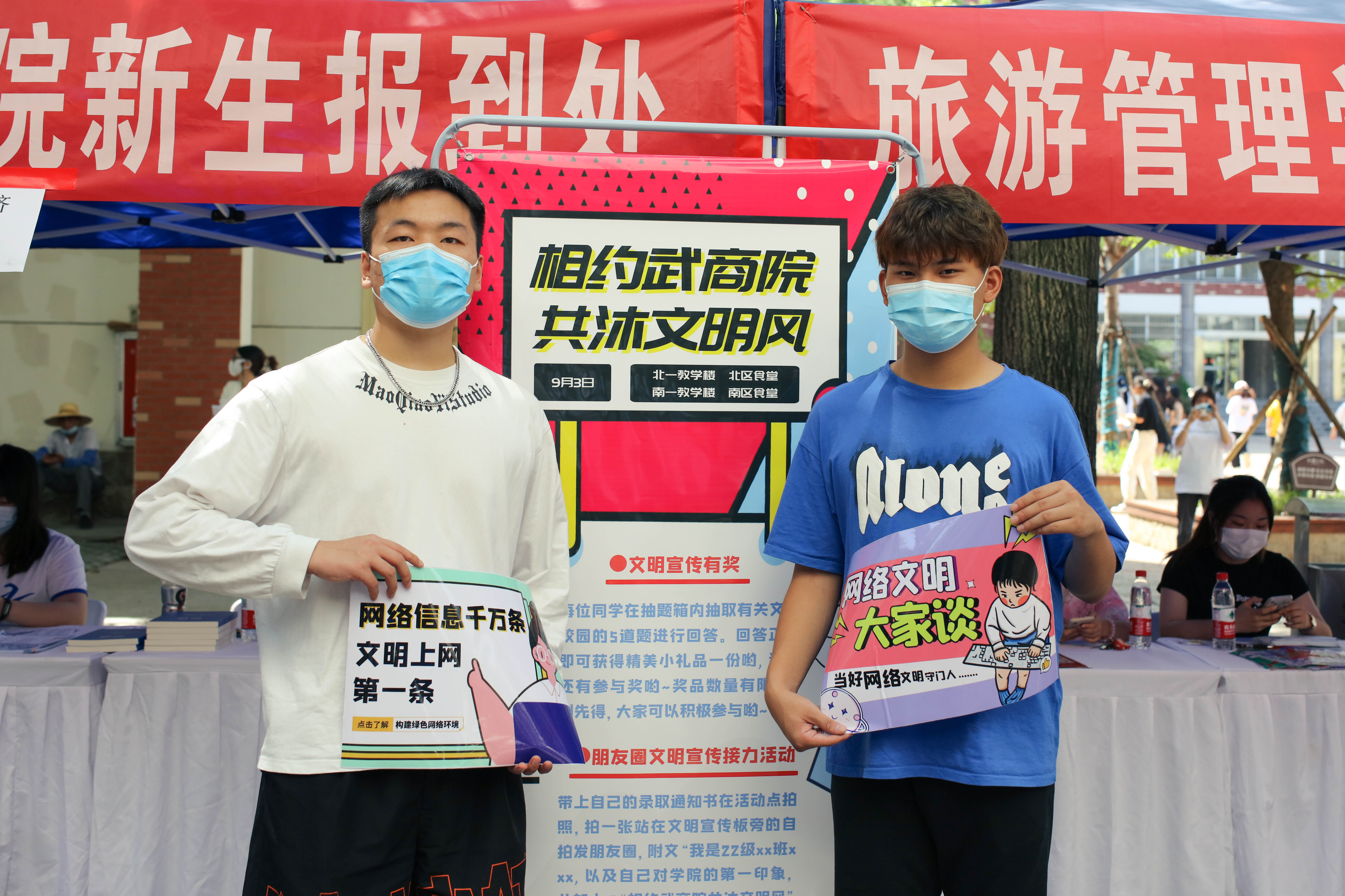 除了各类“一站式”服务,学院现场也为新生发放扇子等小礼品,提供各类相关咨询。在信息工程学院迎新点,院长周天宏亲自为新生送上扇子:“炎炎夏日,清凉一扇。”不仅如此,旅游管理学院迎新点处开展了“相约武商院,共沐文明风”的宣传活动,新生可以带上自己的录取通知书在活动点拍照,发朋友圈并附文对学院的第一印象,并获得精美纪念品。