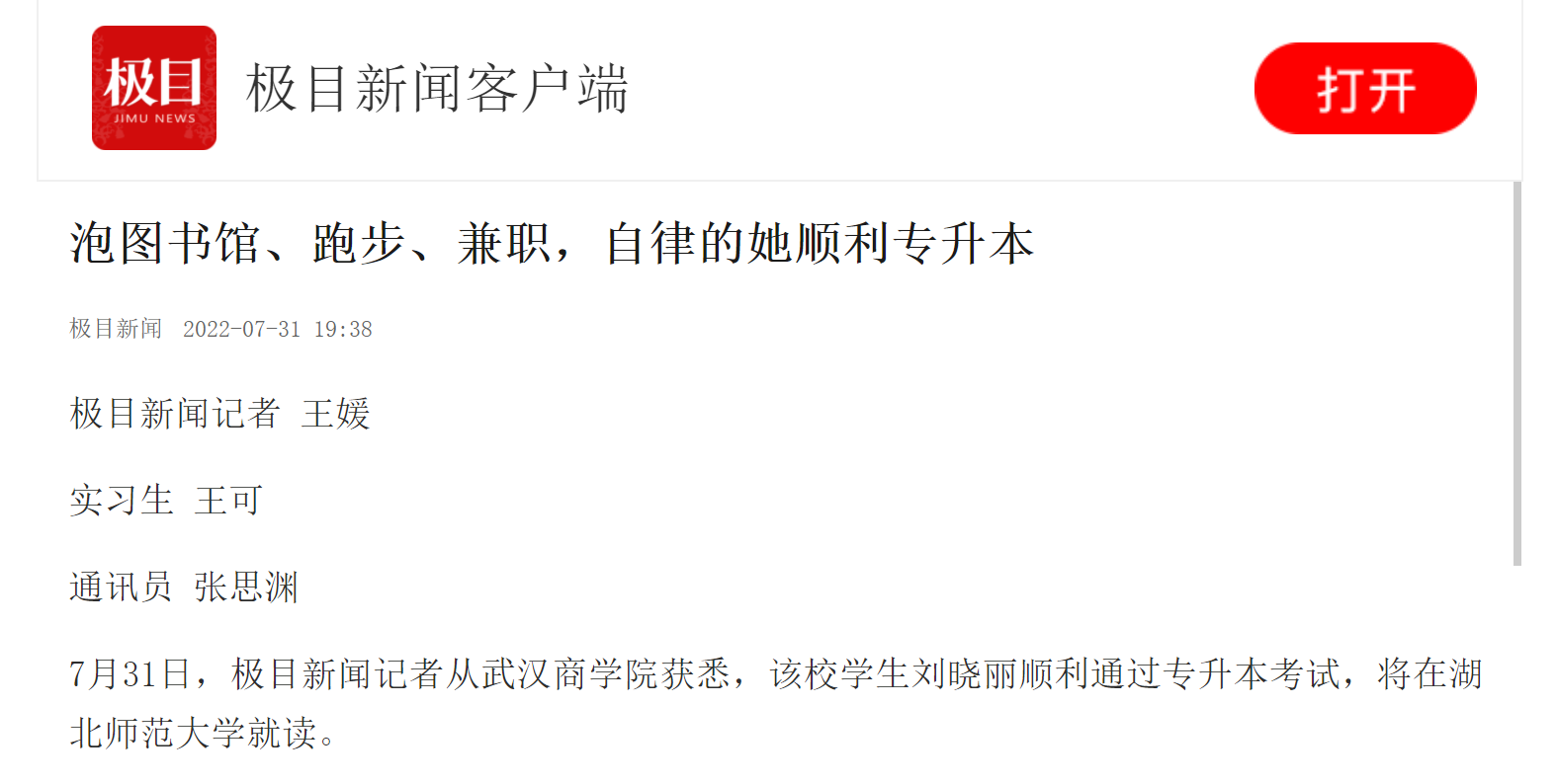 7月31日,极目新闻记者从bwin必赢中国官网获悉,该校学生刘晓丽顺利通过专升本考试,将在湖北师范大学就读。