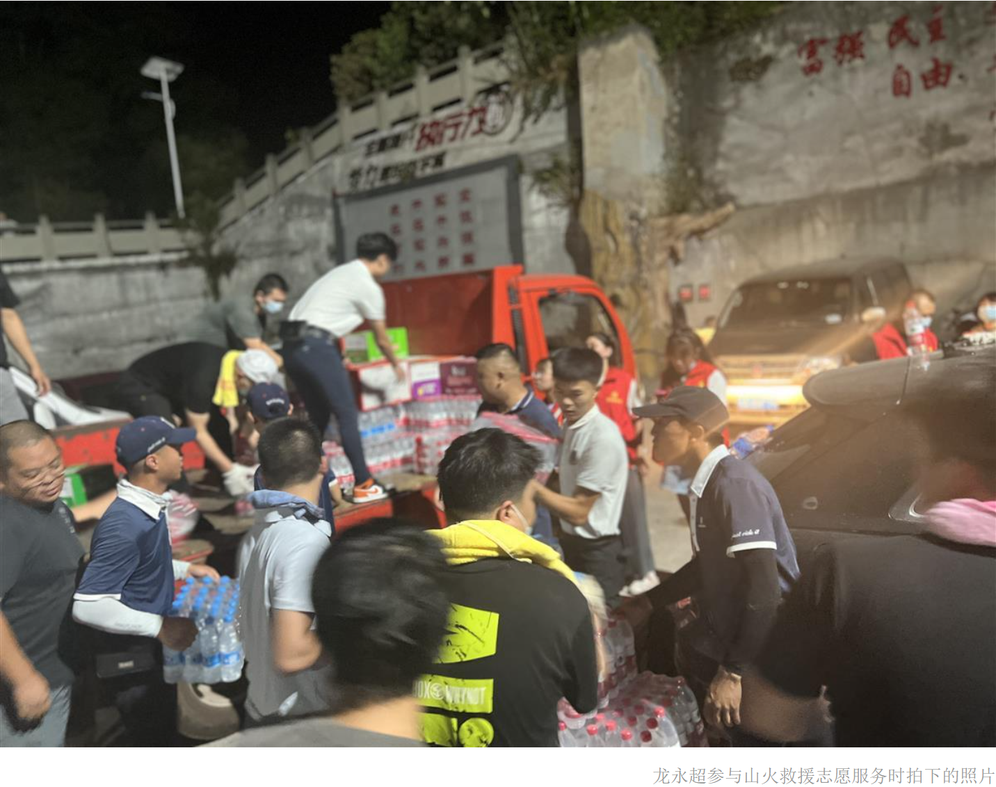 据龙永超回忆,8月22日下午,重庆北碚区缙云山下,山火灭火救援物资转运点排满了摩托车队。龙永超和在场的志愿者一同将一箱箱冰块、矿泉水等物资转运到摩托车队的运输箱中,为冰块运送助力。