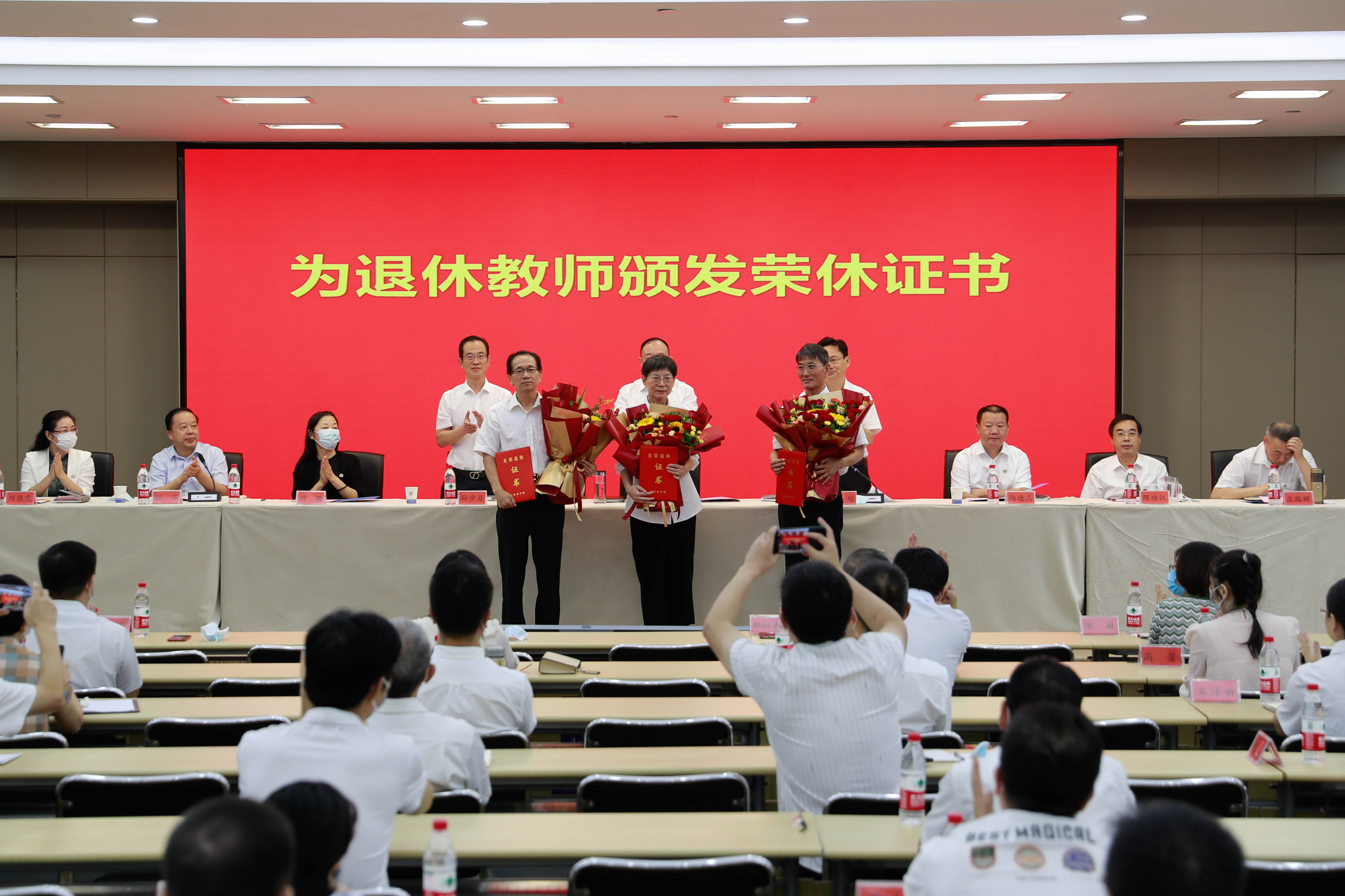 9月8日上午,我校在行政楼多功能厅举办庆祝第38个教师节大会,表彰2022年师德楷模和师德先进个人,为退休教师举办荣休仪式,新进教师入职宣誓,动员全校教师进一步坚定信心、拼搏争先,推动学校各项事业实现新发展,以实际行动和优异成绩喜迎党的二十大胜利召开。全体校领导、二级单位主要负责人、教师代表参加大会。会议由校长彭瑜主持。