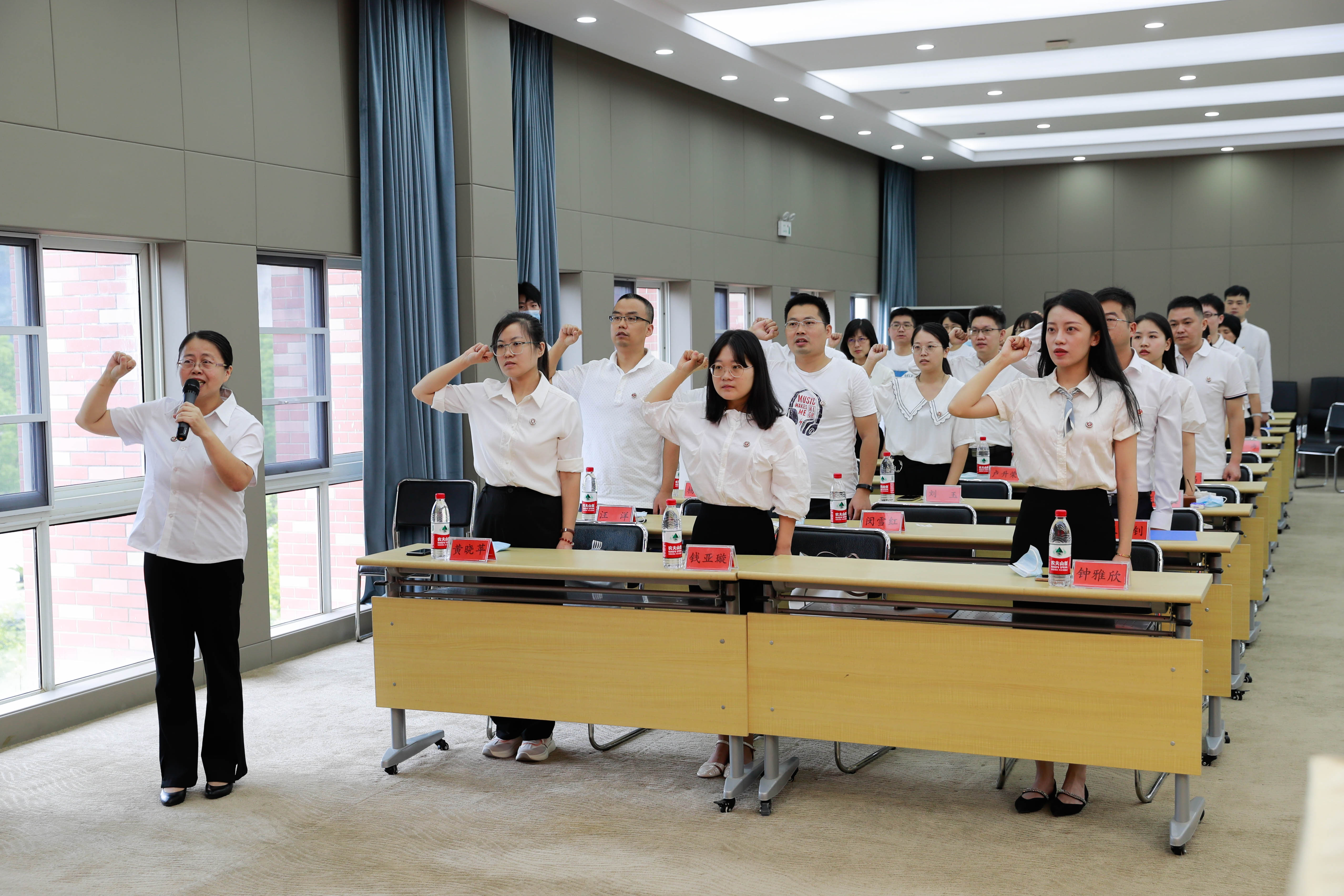 首位“师德楷模”获得者、通识教育学院教师岑泽丽带领24名新进教师入职宣誓。体育学院·国际马术学院王钊作为代表进行发言。王钊分别从三个关键词感恩、责任、担当分享自己的感悟,承诺将在考验中成长、在历练中担当,全心全意做学生锤炼品格、学习知识、创新思维、奉献祖国的引路人。