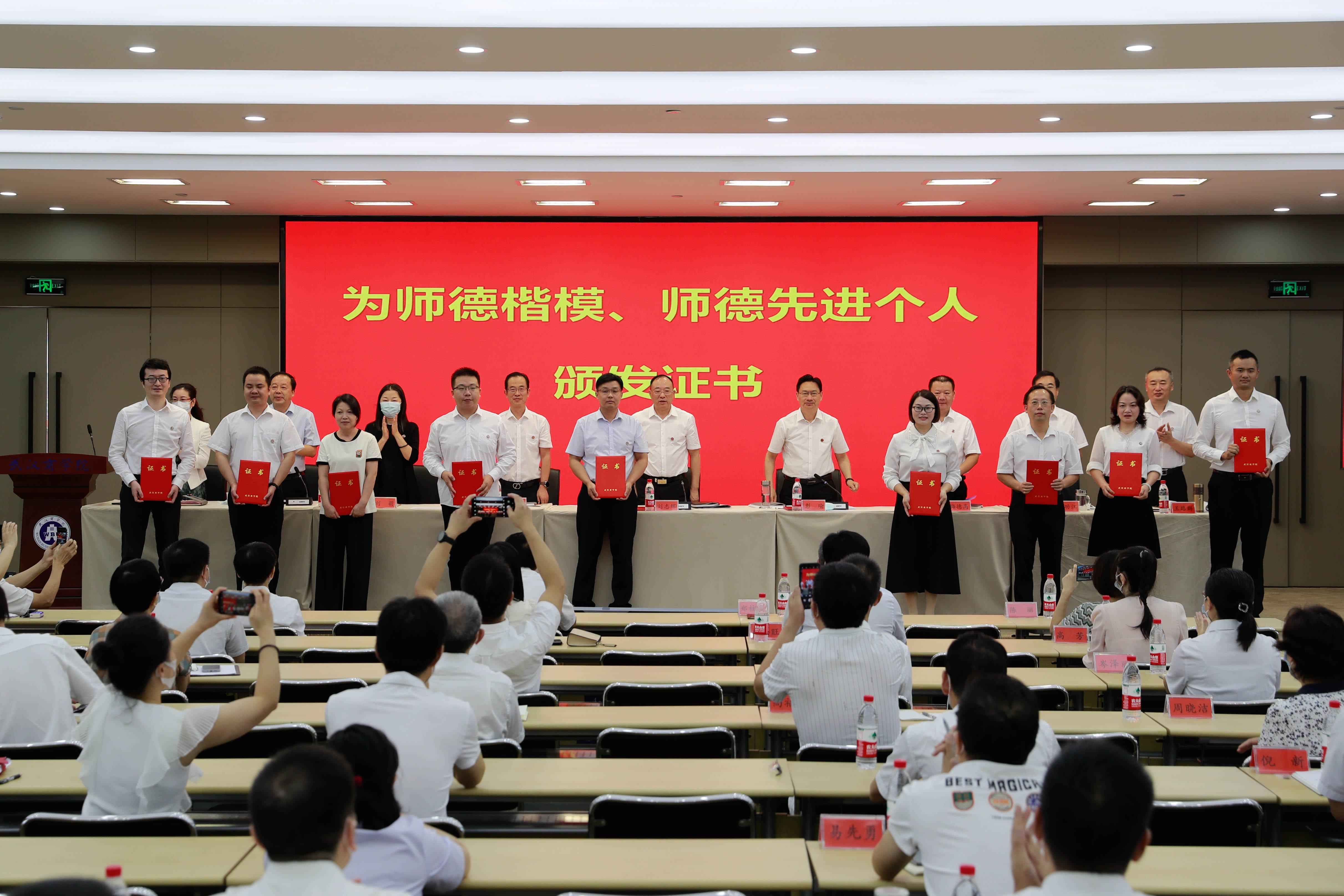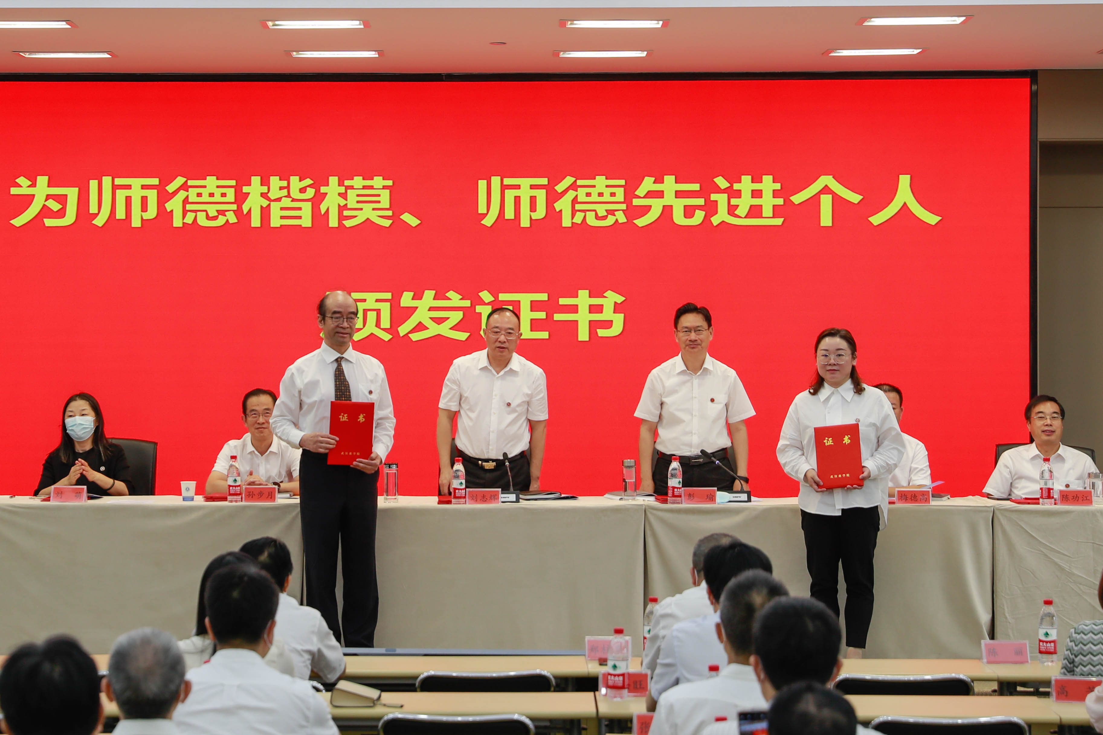 副校长张石宣读《关于表彰2022年师德楷模、师德先进个人的决定》,方元法、夏黎获“师德楷模”荣誉称号,谢美娥、刘寒月、张千红、张欢欢、余刚、刘桢、王全利、郑拓、何桂美、徐超获“师德先进个人”荣誉称号。全体校领导为获奖人员颁发证书。师德楷模代表、工商管理学院教师夏黎分享自己的“师德”感悟,从教23年,夏黎当过9年班主任,她注重学思结合知行统一,对学生耐心引导、倾囊相助。面对专业转型新挑战,她勇于创新、敢于开拓,带领教学团队开创湖北省首个特色本科专业——零售业管理专业,构建新零售背景下“五联合三融合”的特色专业建设模式。作为教师支部书记和专业负责人,她充分发挥“头雁效应”,以“党建+师德师风”为指引践行双带头人的使命,处处打头阵,做好党员的一面旗帜。