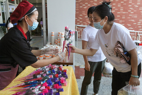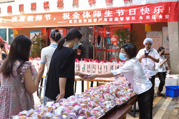 本网讯 最圆的月亮在中秋,最好的团圆在武商。恰逢“双节”,南区北区食堂精心策划在节日来临之际,为老师、学生们送上一份温暖的节日问候,将学校的温暖传递。9月9日中午,北区食堂门口摆放着近3000余份的月饼与300份花束,同时为同学们供应清凉解暑的绿豆汤。南区食堂门口也提供了4000余份的月饼,200份礼盒花束,精美的礼品引得同学们驻足观看。