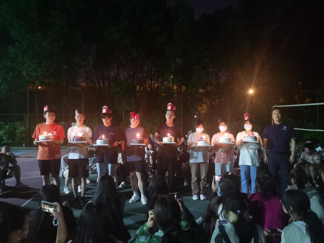 最后一项“师生同庆生”把班会推上了高潮,一个个点燃蜡烛的生日蛋糕在皎洁的月光映衬下被端上了团圈中央,鲍老师对9月份生日的同学逐一点名上台,由李平院长为他们带上了生日的“皇冠”及祝福,表示“儿生母苦,感恩父母,国际学院今后就是同学们的新家”。