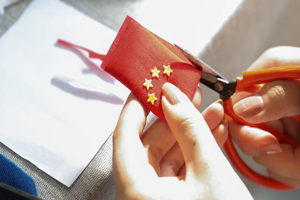 布艺堆绣听则易,做而难,“五星红旗”的白色底板需剪刀裁边,沿线修整,绕至一圈,达到光滑圆润,而后于光面上胶,抹匀贴绵,垂直而剪,续将红布附着于绵底,留置3毫米缝头,红白交接处均涂乳胶,四边微折,指腹轻压,力求红布白板水乳交融。红旗规正在红布,大红星与直边保持恰当之距,并将四枚小红星均匀散布在大红星右侧。胸针别于红布浆板,并轻挑慢捻穿梭迂回于浆板剪出的两小口,再次上胶并把浆板粘在红旗后,一个完整的“五星红旗”由此诞生。同学们在制作“五星红旗”的过程中,冯晓明多次强调每一步的细节。白板边缘光滑,乳胶均匀如水,小红星尖角对准大红星中心……简单的成品往往需要复杂的工序,同学们在这堂课中学到了做好传统工艺时所需的耐心和细心。冯晓明回忆起当年成为非遗传承人,着手布衣堆绣的时候十分感慨。她坦言,自己从小受家庭影响,坚持热爱是支撑自己十多年将布艺堆绣之路走下去的最大动力。