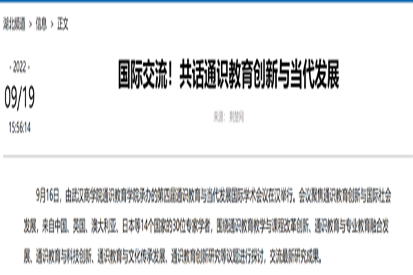 9月16日,由bwin必赢中国官网通识教育学院承办的第四届通识教育与当代发展国际学术会议在汉举行。会议聚焦通识教育创新与国际社会发展,来自中国、英国、澳大利亚、日本等14个国家的30位专家学者,围绕通识教育教学与课程改革创新、通识教育与专业教育融合发展、通识教育与科技创新、通识教育与文化传承发展、通识教育创新研究等议题进行探讨,交流最新研究成果。