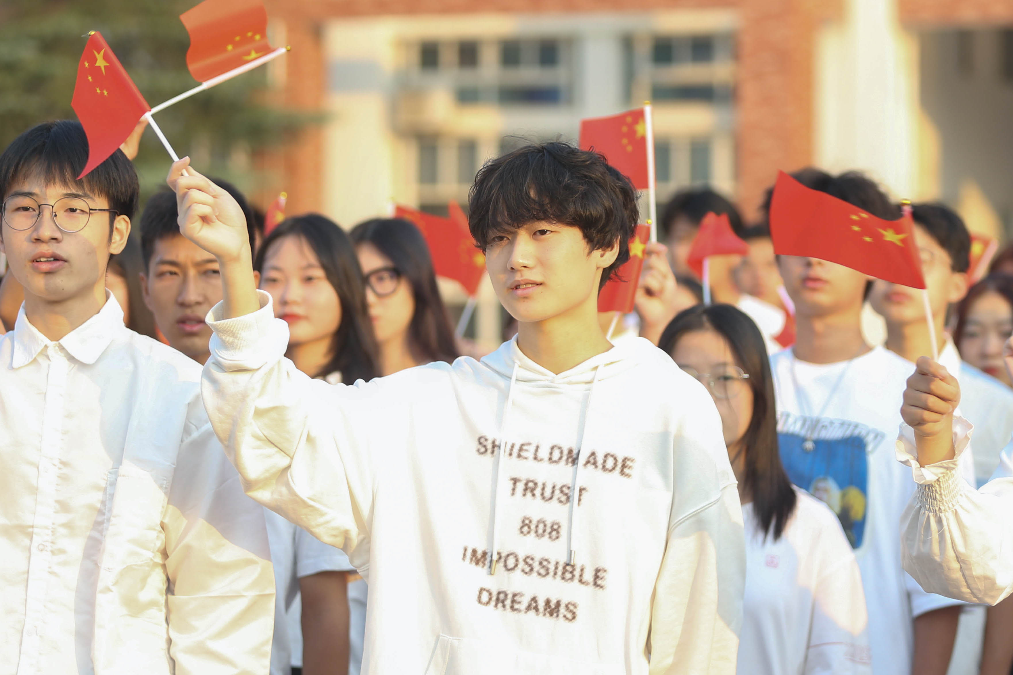 升旗仪式最后,在场师生手执国旗挥舞,高唱《我和我的祖国》,向新中国成立73周年献礼。