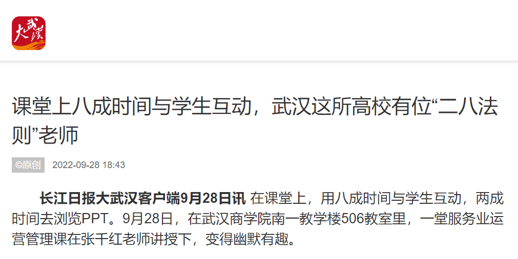 在张千红的课堂上,有一个很有意思的现象:他会拿出80%的时间来与学生交流互动,最多留20%的时间去浏览一下课程PPT,这是张千红所提倡的“二八法则”。