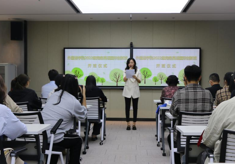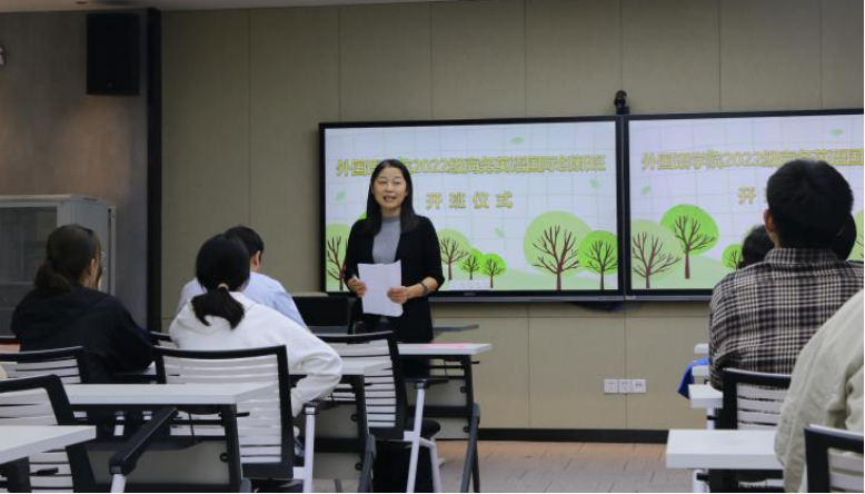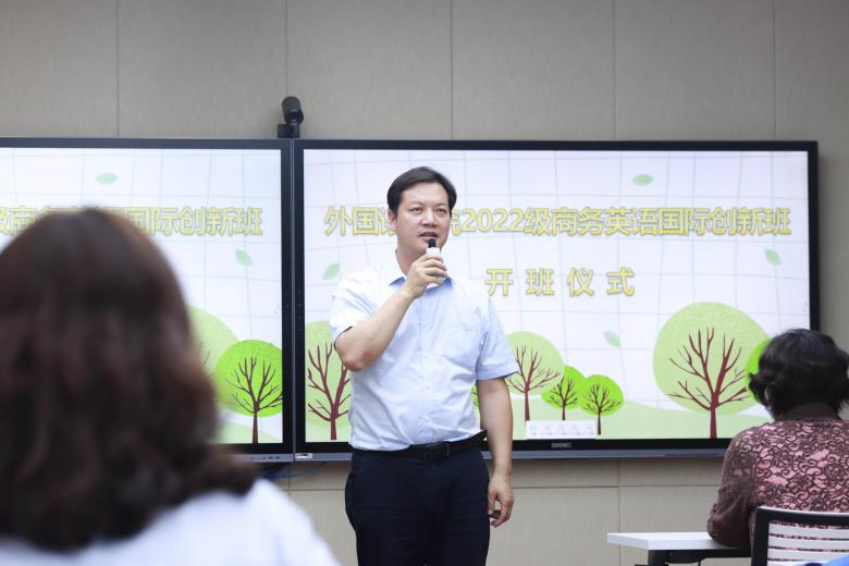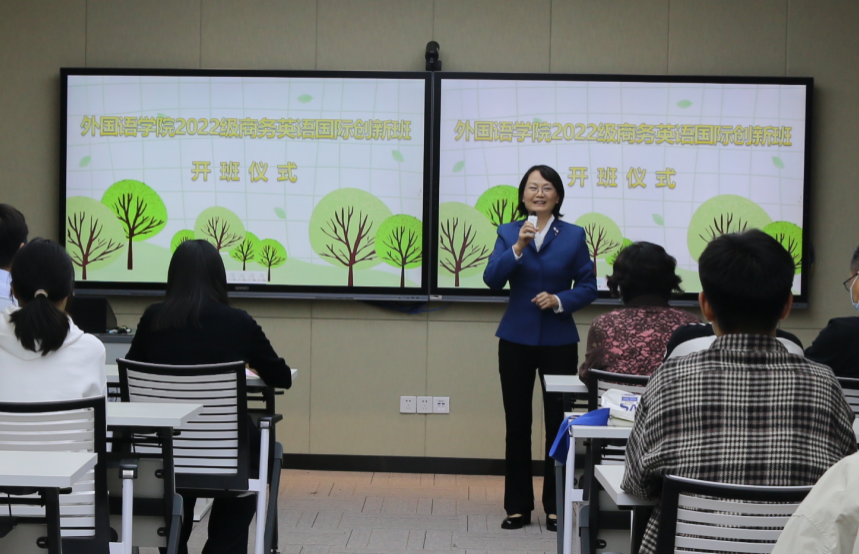 本网讯 10月4日下午,2022级商务英语国际创新班开班仪式在北4--211教室举行。副校长刘萌、国际交流合作处处长李平、外国语学院院长李萍、外国语学院党委书记周晓洁、院党委副书记芦红兵、教学科研负责人忻竞、教师代表及国际创新班全体同学参加。