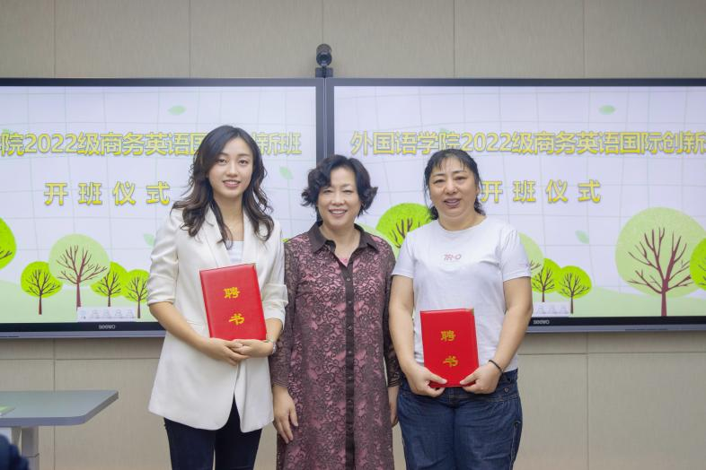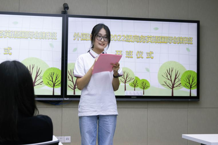 开班仪式上,外国语学院党委书记周晓洁宣读了2022级国际创新班的学生名单,并向该班班主任沈忻老师、辅导员钟敏老师颁发了聘书。