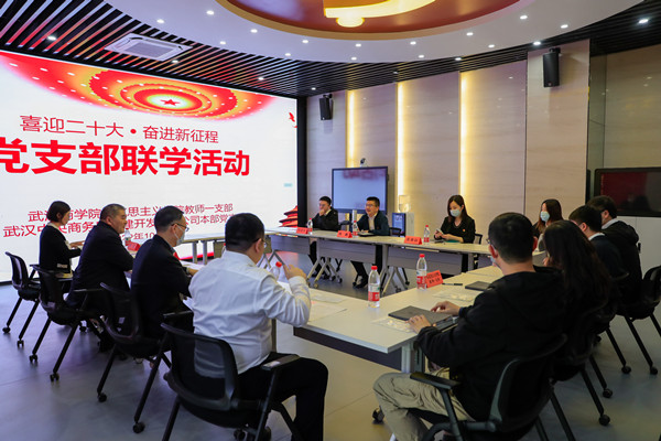 本网讯 校企携手促党建,结对共赢谋发展。为迎接党的二十大胜利召开,10月12日下午,由我校马克思主义学院教师一支部与武汉中央商务区城建开发有限公司本部党支部开展的主题为“喜迎二十大,奋进新征程”党支部联学活动在智慧党建中心举行。活动由马克思主义学院教师一支部书记王晨主持,马克思主义学院院长郑柱泉、党委书记陈丽、副院长刘宗劲,武汉中央商务区城建开发有限公司副总经理陈鹏等人出席。