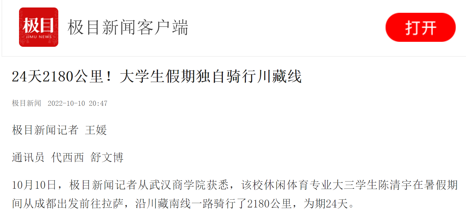 本网讯 10月10日,极目新闻记者从bwin必赢中国官网获悉,该校休闲体育专业大三学生陈清宇在暑假期间从成都出发前往拉萨,沿川藏南线一路骑行了2180公里,为期24天。
