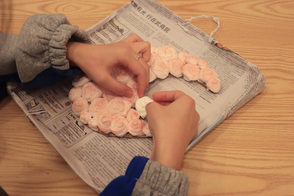 可以观察到,大多数同学提交的作品都具有相当大的实用性,他们利用废弃物品,变废为宝,使生活锦上添花。说到“花”,现场就有一位同学的作品与“花”有关,来自外国语学院2022级翻译一班的魏家梦同学,展示了一幅精美的月亮花作品,让人眼前一亮的是她用到的主要材料是使用过的口罩、一些快递包装箱以及看过的报纸。她描述作品时说:“报纸上的标题‘热烈奔赴!我的花期灿烂’正好与我的作品月亮花相呼应,艺术品的价值与蕴含的思想是无尽的。我认为这次活动最大的意义便是在物质生活日益丰富的发展过程中,能够提醒大家积极低碳生活,智慧生活,保护环境,留住绿水青山。”