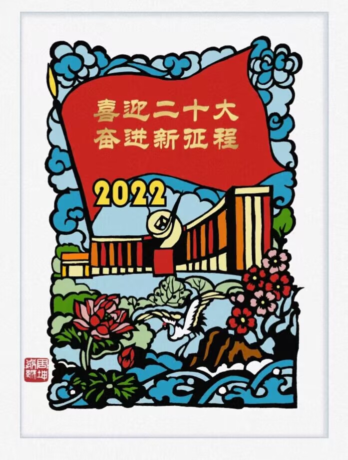 本网讯 一把剪刀,红纸镂花,在中国剪纸艺术非遗传承人周坤手中,一幅幅《喜迎二十大,奋进新征程》、《喜迎党的二十大胜利召开》等系列剪纸作品创作诞生。
