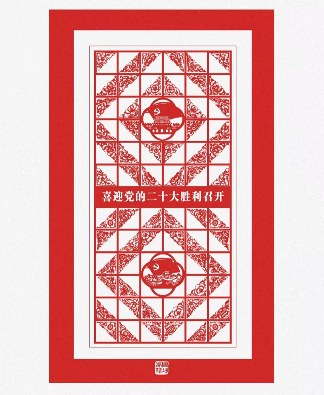 不同于《喜迎二十大,奋进新征程》,周坤的另一幅《喜迎党的二十大胜利召开》长达1.3米,宽66厘米,在创作上,周坤采用窗花元素,选择传统宣纸,以对称方格形式拼接,耗时半个月拼凑成而成。“每张小格子上精心选象,蝴蝶象征着“福”叠,刻画鲤鱼象征年年有余,喜鹊上枝头寓意喜上眉梢,代表中国元素的梅兰竹菊、四季花等加以点缀不仅增添作品趣味,还寄托着对祖国未来发展的美好愿景。”周坤介绍。此次献礼二十大系列剪纸作品共五幅,还包括《奋进新征程,建功新时代》、《喜迎二十大,永远跟党走》《社会主义核心价值观》。