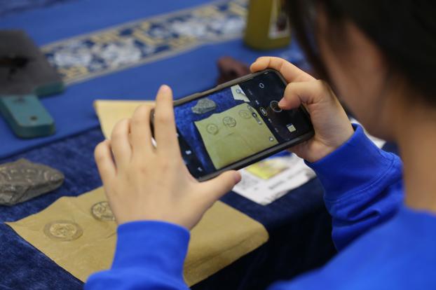 宣纸浸润敷器物,朱墨扑拓现原本。随着拓印材料的布置,现场学生跃跃欲试,纷纷想亲自动手体验拓印技艺魅力。2021级国际商务专业学生叶梓拿到材料先将生宣纸剪裁成比拓印器物略大的方形,把浸湿的宣纸敷在凸凹不平的文字或纹饰上,用扫刷自中心向边缘轻刷,赶出气泡,让宣纸与器物纹饰紧密贴合。等待时,叶梓分享说,自己从小就喜欢手工活儿,每次都早早报名国学小课,还会提前在网上做好功课,就为了能亲自体验这些传统技艺。