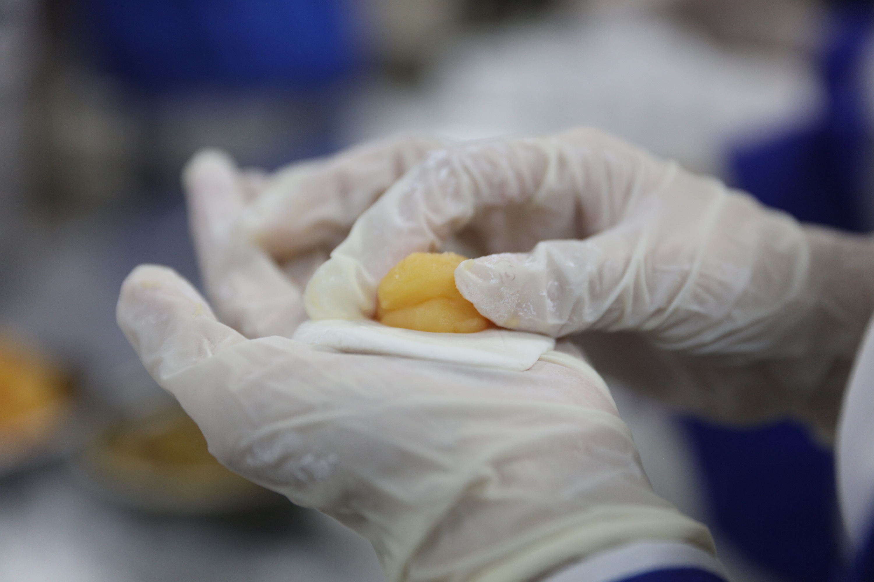 抹茶粉、鱼松粉、糯米粉……一应俱全,抹茶馅、紫薯馅、奶黄馅、芝麻馅……应有尽有。当天下午两点,食品科技学院青年志愿者协会的志愿者们早早就准备好了包汤圆的材料,同学们左手扶着盆,右手不停和面。2022级食品质量与安全一班鄢然揉起面团来十分娴熟,一块块糯米面团在她手中搓成圆滚滚的形状,将中间按压后塞入馅料,晶莹光亮的汤圆就做好了,她分享道:“我是湖北黄石人,每年立冬我妈妈都会自己制作汤圆,以前在家都会和家人一起揉面团搓汤圆,没想到今年在学校也有这样的机会。”
