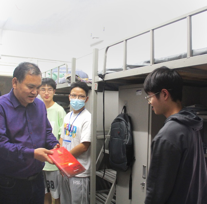 在走访过程中,熊文杰书记与舒靖钧老师亲切地与学生交谈,详细询问了学生在校的学习、生活、饮食等多方面的情况,并为学生现有的困惑提出了相关建议。熊文杰书记表示,希望学生们珍惜校园生活,在认真学习的同时,还应严格按照要求做好疫情防控,积极参与体育锻炼和各项活动,丰富疫情防控常态下的校园生活,做到德智体美劳的全方位发展。最后,熊文杰书记给走访的每个宿舍赠送一本《一百位共产党员的红色家书》,希望同学们读红色家书,多与父母家人沟通,从红色家书中汲取红色基因,从家人的关怀中得到温暖和支持。